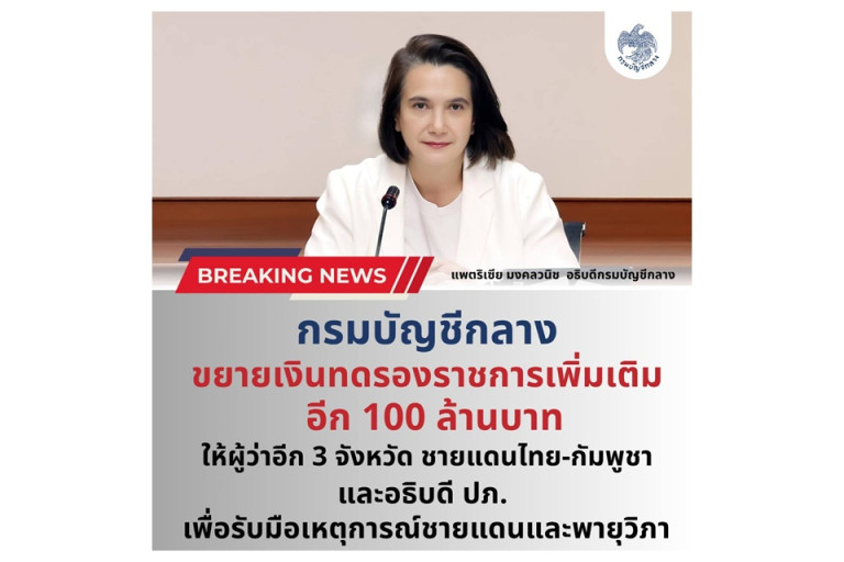 กรมบัญชีกลางขยายเงินทดรองราชการเพิ่มเติมอีก 100 ล้าน ให้ผู้ว่าอีก 3 จังหวัด ชายแดนไทย - กัมพูชา และขยายวงเงินทดรองให้อธิบดี ปภ. เพื่อรับมือเหตุการณ์ชายแดน และ พายุ “วิภา”