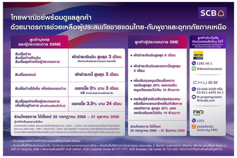 วันที่ 27 ก.ค.68 จากสถานการณ์ ความขัดแย้งระหว่างไทยและกัมพูชาและสถานการณ์อุทกภัยฉับพลันจากอิทธิพลของพายุ “วิภา” ที่เกิดขึ้น ซึ่งส่งผลกระทบอย่างรุนแรงต่อทรัพย์สินและความเป็นอยู่ของประชาชนในหลายพื้นที่ทั่วประเทศ ธนาคารไทยพาณิชย์ตระหนักถึงความเดือดร้อนของลูกค้า และพร้อมอยู่เคียงข้างเพื่อให้ความช่วยเหลืออย่างเต็มกำลัง ผ่านมาตรการเร่งด่วนที่ครอบคลุม ทั้งลูกค้าบุคคล ลูกค้าสินเชื่อธุรกิจเพื่อผู้ประกอบการและลูกค้าผู้ประกอบการ SME โดยให้ความช่วยเหลือสำหรับลูกค้าปัจจุบันและลูกค้าใหม่ ทั้งในรูปแบบการพักชำระหนี้ และการสนับสนุนสินเชื่อใหม่เพื่อซ่อมแซมที่อยู่อาศัย รวมถึงฟื้นฟูกิจการที่ได้รับผลกระทบ โดยมีรายละเอียดดังนี้