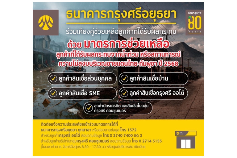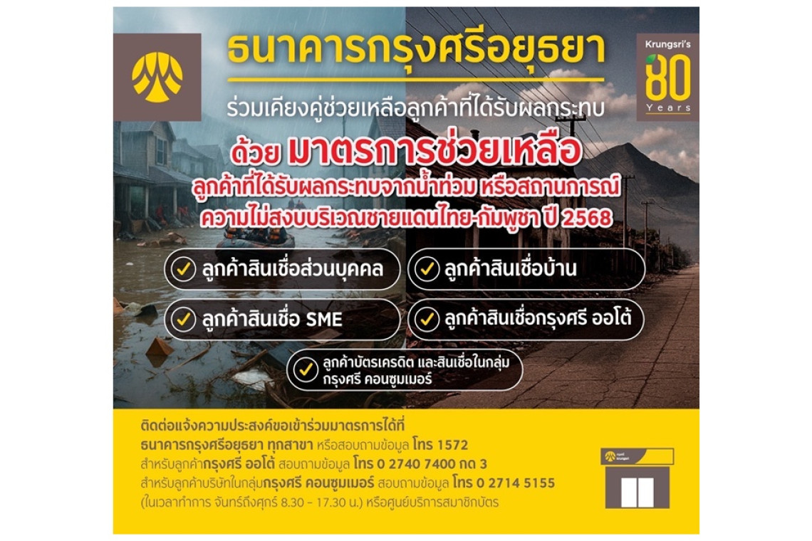 กรุงศรีออกมาตรการเร่งด่วนเพื่อช่วยเหลือลูกค้าที่ได้รับผลกระทบจากน้ำท่วม และสถานการณ์ความไม่สงบบริเวณชายแดนไทยกัมพูชา