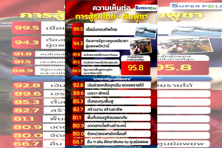 “การสำรวจความคิดเห็นของประชาชนครั้งนี้ จึงมีเป้าหมายสำคัญในการ “ฟังเสียงประชาชน” อย่างรอบด้าน โดยมิใช่เพียงการนับตัวเลขความนิยมหรือความกลัว แต่คือการตีความเจตจำนงของสาธารณะในการมีส่วนร่วมต่ออนาคตของชาติในยามวิกฤต ทั้งในมิติความเชื่อมั่นต่อกองทัพ ความห่วงใยต่อผู้อพยพ ความต้องการความสามัคคีในสังคม ไปจนถึงความคาดหวังต่อมาตรการเยียวยาและฟื้นฟูของรัฐ ผลการสำรวจนี้จึงไม่เพียงสะท้อนอุณหภูมิความรู้สึกของสังคมเท่านั้น หากยังชี้ให้เห็นถึง “ทุนทางสังคม” (Social Capital) ที่ประเทศไทยยังคงมีอยู่อย่างมั่นคง พร้อมจะถูกนำมาใช้เพื่อพลิกวิกฤตให้เป็นพลังแห่งความร่วมมือในการขับเคลื่อนประเทศไปข้างหน้าอย่างมีทิศทาง” ผอ.ซูเปอร์โพล กล่าว
