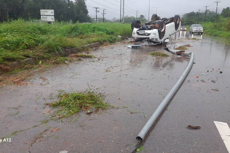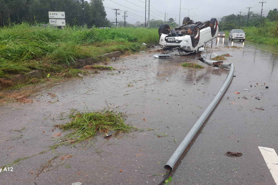 หนุ่มก่อสร้างชาวกัมพูชารอดตายไร้รอยขีดข่วนหลังขับรถไปหานายจ้าง ถนนลื่นเสียหลักพุ่งขึ้นเกาะกลางชนเสาไฟพลิกหงายท้องพังยับเชื่อพุทธคุณหลวงพ่อแพรปิดตาห้อยคอ ทำแคล้วคลาด