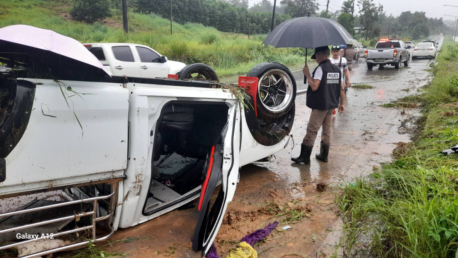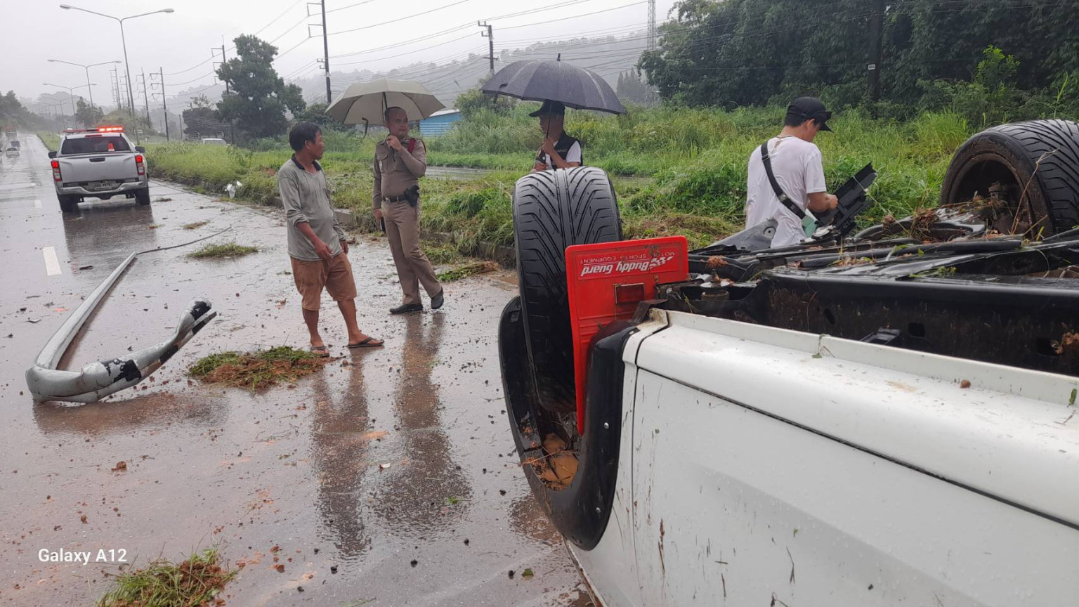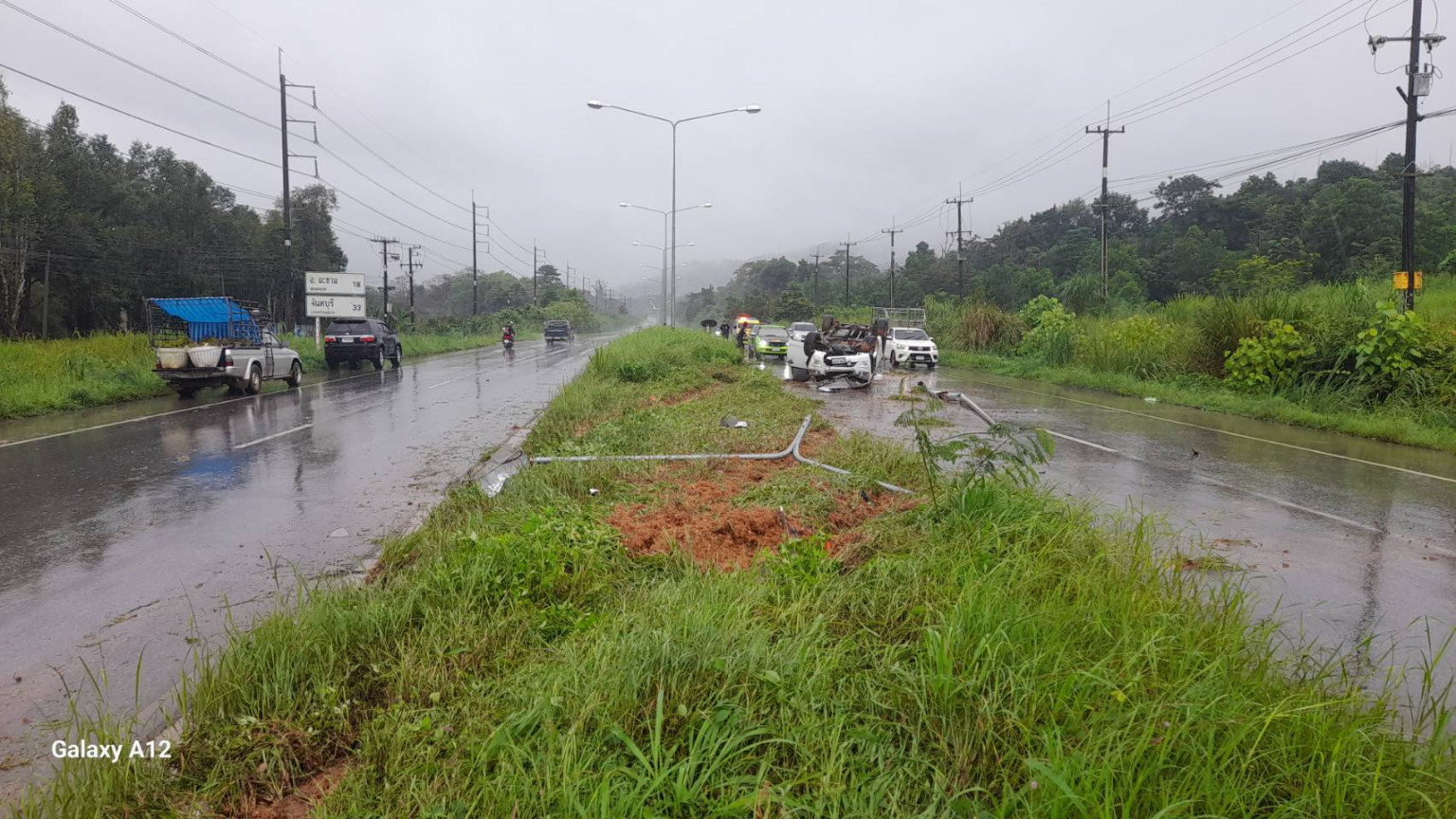 ที่เกิดเหตุ พบรถยนต์กระบะ อีซูซุ สีขาว ทะเบียน บต. 8301 ตราด อยู่ในสภาพพลิกหงายท้อง ล้อชี้ฟ้าอยู่ในช่องจราจรฝั่งขาเออกเมือง พังเสียหาย ที่เกิดเหตุยังพบร่องรอยล้อรถปีนเกาะกลางถนนพุ่งไปชนกับเสาไฟส่องสว่าง ล้มถอนรากล้ม หลุดออกมาทั้งต้น โดยที่โดนเสายังมีสายไฟและลวดทองแดงโผล่ออกมา จึงระสานเจ้าหน้าที่แขวงการทาง ทำการตัดกระแสไฟ เกรงจะมีคนได้รับอันตราย เนื่องจากบริเวณมีฝนตกพร้อมถ่ายรูปบันทึกไว้เป็นหลักฐาน