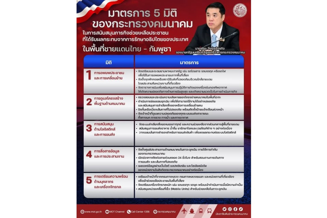 “สุริยะ” จัดเต็ม! เปิด 5 มาตรการ ช่วยเหลือประชาชนที่ได้รับผลกระทบจากสถานการณ์ชายแดนไทย - กัมพูชา ระดมยานพาหนะพร้อมอพยพ - ดูแลโครงสร้างพื้นฐานสนับสนุนการเคลื่อนย้าย - จัดระบบลำเลียงสิ่งของ - ตั้งศูนย์ “คมนาคม” สื่อสารพี่น้องประชาชนตลอด 24 ชั่วโมง - เตรียมพร้อมบุคลากรเครื่องจักร หนุนภารกิจชายแดน