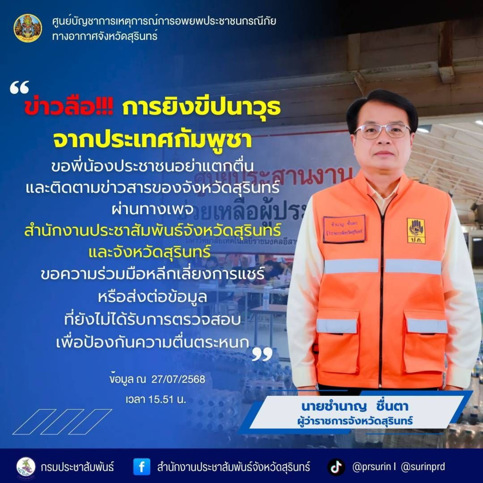 วันที่ 27 ก.ค. 68 เวลา 15.51 น.ผู้สื่อข่าวรายงาน ว่า เพจ สนง.ประชาสัมพันธ์จังหวัดสุรินทร์ ได้โพตส์ ข้อความและรูปภาพ นายชำนาญ ชื่นตา ผู้ว่าราชการจังหวัด พร้อมระบุข้อความว่า ข่าวลือการยิงขีปนาวุธจากประเทศกัมพูชา ขอพี่น้องอย่าแตกตื่นและติดตามข่าวสารของจังหวัดสุรินทร์ ผ่านทางเพจ สำนักงานประชาสัมพันธ์จังหวัดสุรินทร์และจังหวัดสุรินทร์ โดยขอความร่วมมือหลีกเลี่ยงการแชร์หรือการส่งต่อข้อมูลที่ยังไม่ได้รับการตรวจสอบเพื่อป้องกันความตื่นตระหนก (ข้อมูล ณ 27/07/2568 เวลา 15.51 น.