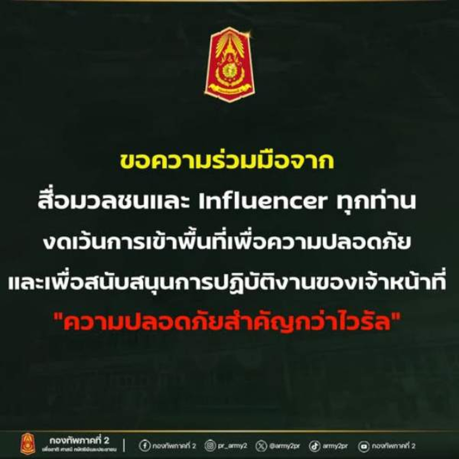 เนื่องจากสถานการณ์ความตึงเครียดในพื้นที่ชายแดนไทย-กัมพูชา มีความเสี่ยงต่อความปลอดภัยของพี่น้องประชาชน และเจ้าหน้าที่ทุกฝ่าย ขอความร่วมมือพี่น้องสื่อมวลชน และ Influencer ดังนี้