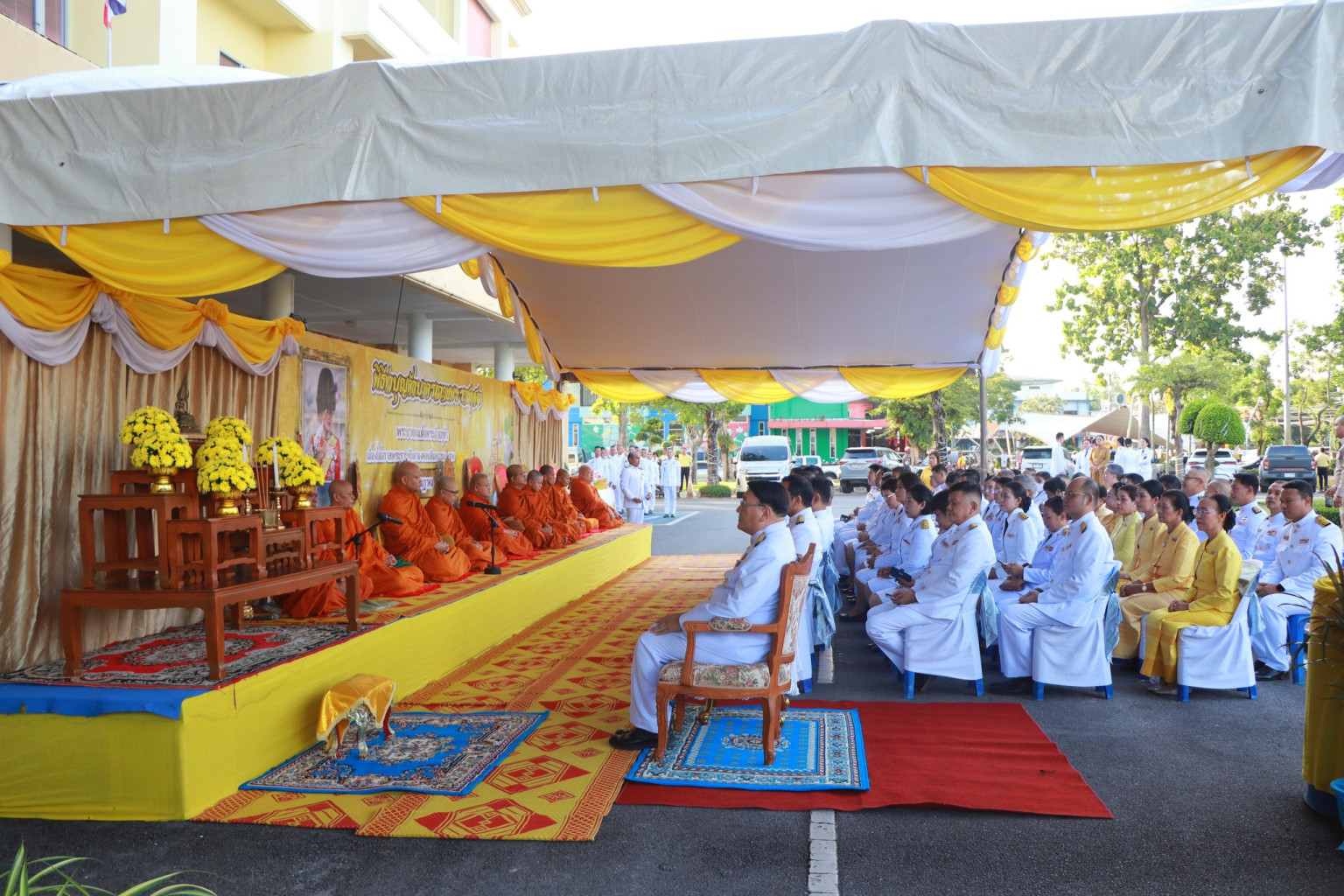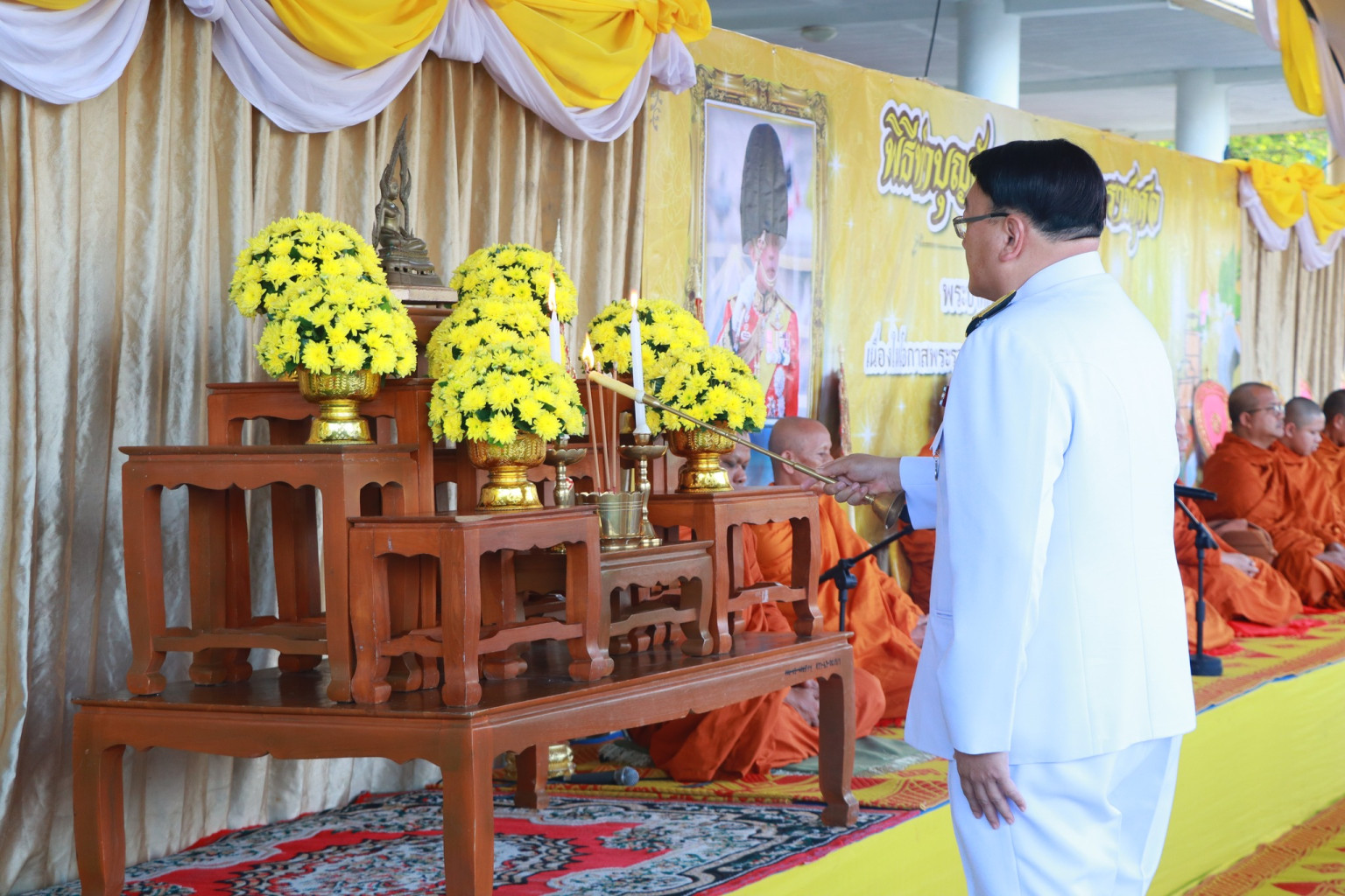 โดยพิธีเริ่มตั้งแต่เวลา 07.00 น. มีพระสงฆ์และสามเณรจำนวน 74 รูป เดินทางมาร่วมพิธี เมื่อถึงเวลา 07.30 น. ผู้ว่าราชการจังหวัดและคู่สมรสเดินทางถึงสถานที่จัดพิธีและเริ่มพิธีสงฆ์ โดยพระสงฆ์ 10 รูป ขึ้นนั่งอาสน์สงฆ์ จากนั้นผู้ว่าราชการจังหวัดได้จุดธูปเทียนบูชาพระรัตนตรัย ถวายธูปเทียนแพหน้าพระบรมฉายาลักษณ์พระบาทสมเด็จพระเจ้าอยู่หัว พร้อมร่วมพิธีอาราธนาศีล เจริญพระพุทธมนต์ ถวายผ้าไตรและเครื่องไทยธรรม พระสงฆ์ให้พรและอนุโมทนา