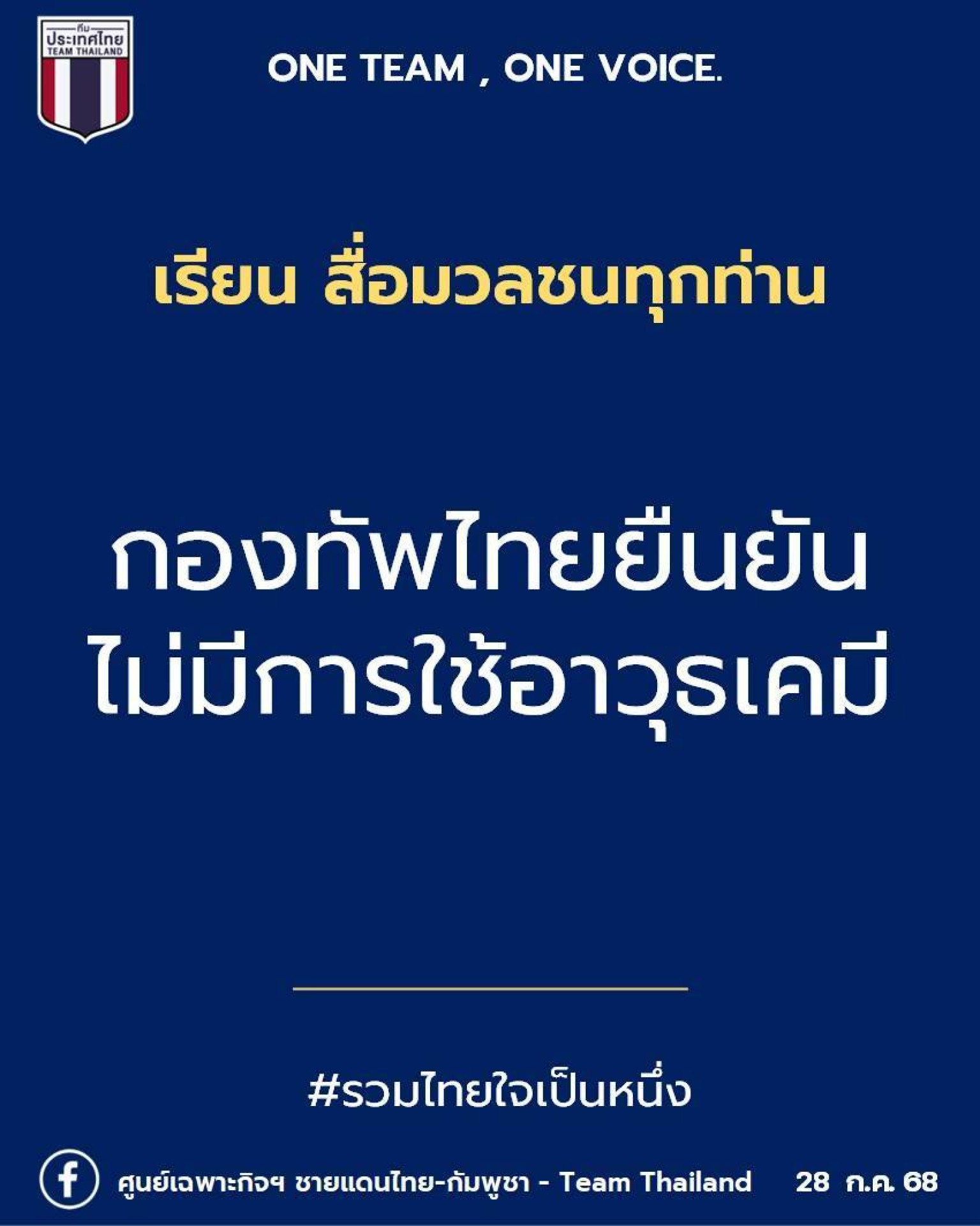 Royal Thai Armed Forces categorically rejects the baseless allegations made by Lieutenant General Maly Socheata, Ministry of National Defense of the Kingdom of Cambodia, accusing Thailand of violating Cambodian sovereignty and employing chemical weapons during military operations. These claims are completely unfounded and constitute a serious distortion of facts.