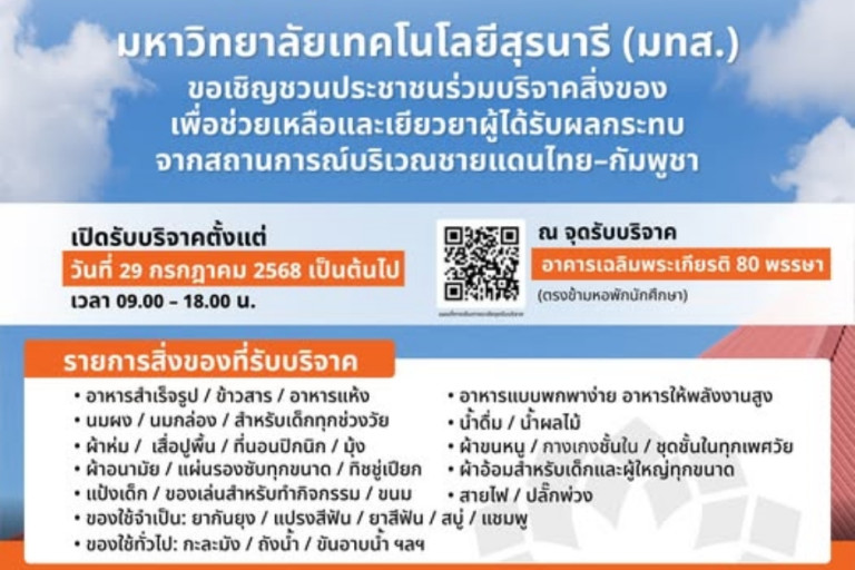 เมื่อวันที่ 28 กรกฎาคม เพจเฟสบุ๊ก “ Suranaree University of Technology ” ได้โพสต์ข้อความ “ มหาวิทยาลัยเทคโนโลยีสุรนารี (มทส.) อ.เมืองนครราชสีมา ขอเชิญชวนประชาชนร่วมบริจาคสิ่งของเพื่อช่วยเหลือและเยียวยาผู้ได้รับผลกระทบจากสถานการณ์บริเวณชายแดนไทย–กัมพูชา เปิดรับบริจาคตั้งแต่วันที่ 29 กรกฎาคม 2568 เป็นต้นไปเวลา 09.00 – 18.00 น. ณ จุดรับบริจาค อาคารเฉลิมพระเกียรติ 80 พรรษา(ตรงข้ามหอพักนักศึกษา)