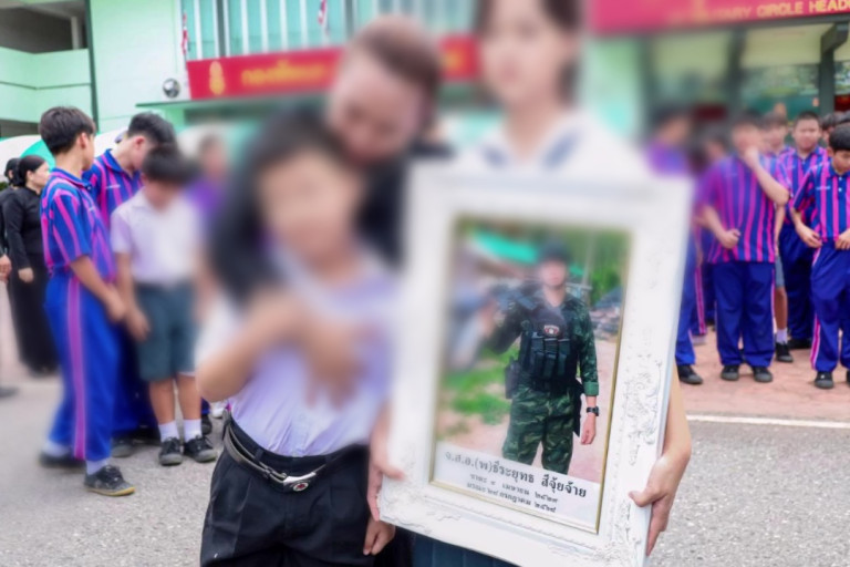ลูกสาวจูบลารูปพ่อ สดุดีทหารกล้า มทบ.24 จ.อุดรธานี กองพันทหารราบที่ 3 กรมทหารราบที่ 13 สดุดีทหารกล้า รับศพจ่าสิบเอกธีระยุทธ สีจุ้ยจ้าย ก่อนเคลื่อนขบวนไปบ้านเกิดที่จ.หนองคาย ในโอกาสนี้ลูกสาวจูบลารูปพ่อเป็นครั้งสุดท้าย