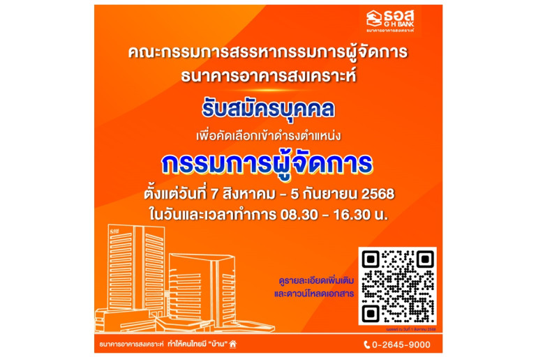 ธอส. เปิดรับสมัครบุคคลเพื่อคัดเลือกเข้าดำรงตำแหน่ง กรรมการผู้จัดการธนาคารอาคารสงเคราะห์ ตั้งแต่วันที่ 7 สิงหาคม - 5 กันยายน 2568