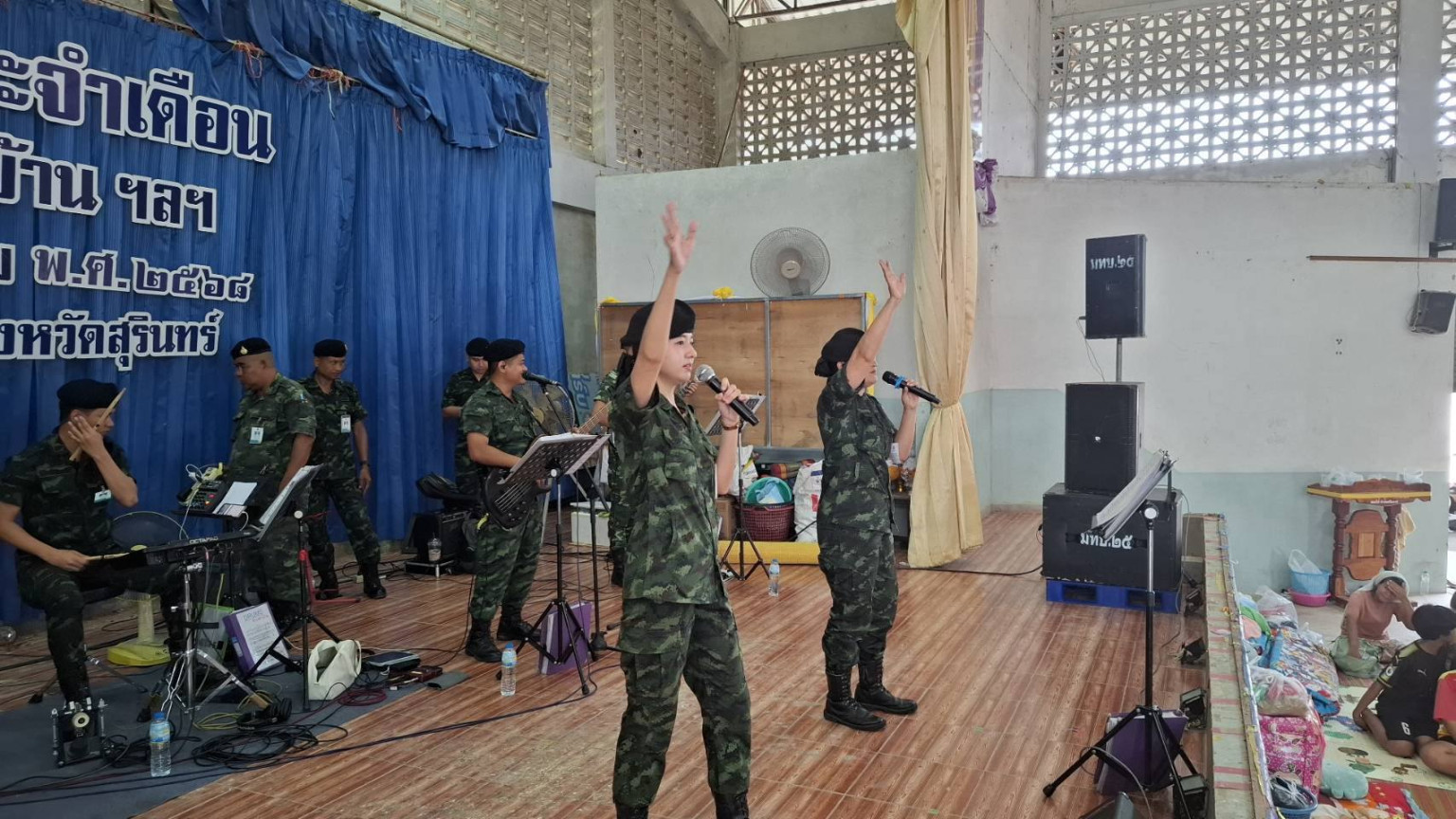 เมื่อวันที่ 2 ส.ค.68 เพจเฟศบุ๊ก "กองทัพภาคที่ 2" โพสต์รูป พร้อมข้อความระบุว่า หมวดดุริยางค์ มณฑลทหารบกที่ 25 จัดแสดงวงดนตรี เพื่อบำรุงขวัญกำลังใจ, สร้างรอยยิ้มและความสุขให้กับประชาชน ณ ศูนย์พักพิงชั่วคราว หอประชุม อ.ศรีณรงค์ จ.สุรินทร์