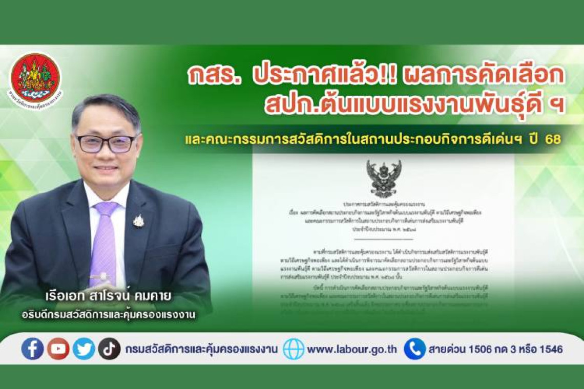กรมสวัสดิการและคุ้มครองแรงงาน (กสร.) ประกาศผลการคัดเลือกสถานประกอบกิจการและรัฐวิสาหกิจ ต้นแบบแรงงานพันธุ์ดี ตามวิถีเศรษฐกิจพอเพียง และคณะกรรมการสวัสดิการในสถานประกอบกิจการดีเด่น การส่งเสริมแรงงานพันธ์ุดี ประจำปีงบประมาณ พ.ศ. 2568 เรือเอก สาโรจน์ คมคาย อธิบดีกรมสวัสดิการและคุ้มครองแรงงาน เปิดเผยว่า กรมให้ความสำคัญกับ