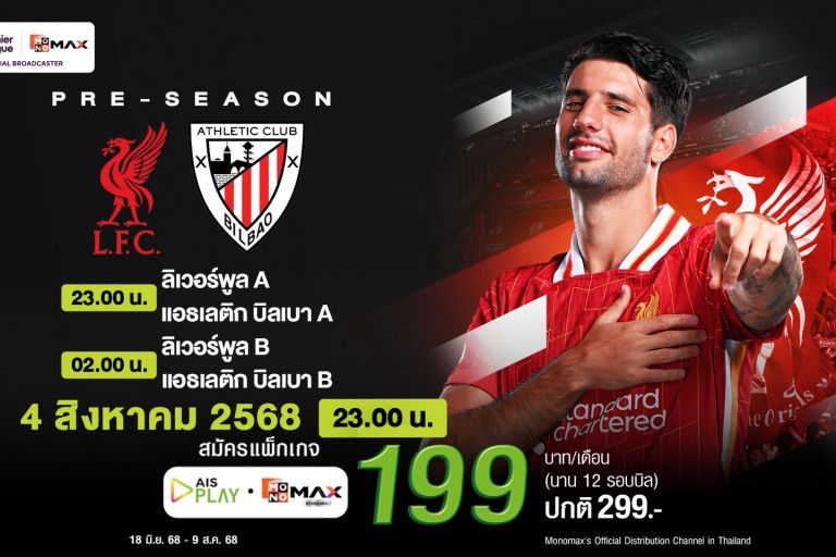หลังจากเสร็จสิ้นการทัวร์เอเชียของทัพ “หงส์แดง” ลิเวอร์พูล ก็เดินทางกลับอังกฤษ เพื่อเตรียมทีมอุ่นเครื่องส่งท้ายปรีซีซั่น โดยจะดวลกับ แอธเลติก บิลเบา ทีมจากลาลีกาสเปน ในช่วงดึกคืนวันที่ 4 สิงหาคมนี้ แบบ 2 นัดติด เวลา23.00น. และ 02.00น. ตามเวลาประเทศไทย โดยทั้งคู่จะ แบ่งทีมเป็น ชุดA กับ ชุดB โดย AIS PLAY กับ MONOMAX จะถ่ายทอดสดให้เหล่าสาวกเดอะค็อป รับชมกันแบบจุใจ