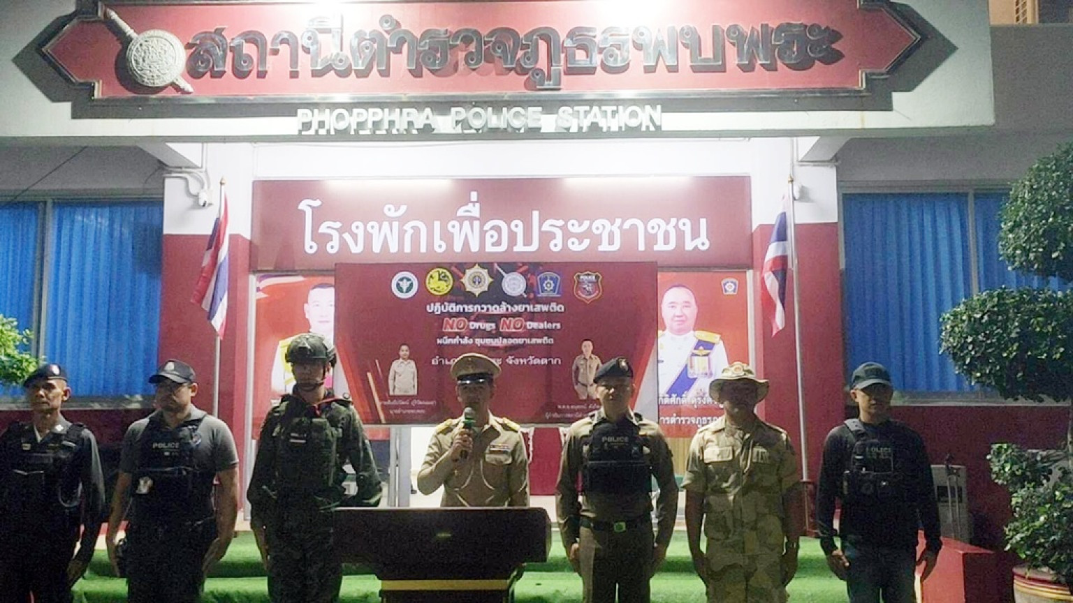 วันที่ 2 ส.ค.68 นายธันย์ปวัฒน์ ภูริวัฒนเมธา นายอำเภอพบพระ พ.ต.อ.อนุสรณ์ ดังก้อง ผกก.สภ.พบพระ พ.ต.ท.นพคุณ อนันตวงศ์ รอง ผกก.สส.สภ.พบพระ นายอรรถวุฒิ จันทร์เจริญ ปลัดอำเภอพบพระ,เจ้าหน้าที่ทหาร,เจ้าหน้าที่ตำรวจตระเวนชายแดน ทำพิธีปล่อยแถวระดมกวาดล้างยาเสพติด No drugs No dealers ผนึกกำลังชุมชนปลอดยาเสพติด โดยมีเจ้าหน้าที่ตำรวจสถานีตำรวจภูธรพบพระ,เจ้าหน้าที่ฝ่ายปกครองอำเภอพบพระ,เจ้าหน้าที่ตำรวจตระเวนชายแดน,เจ้าหน้าที่ทหาร เข้าร่วมพิธี รวมจำนวนทั้งสิ้น 80 นาย ณ ลานหน้าสถานีตำรวจภูธรพบพระ อำเภอพบพระ จังหวัดตาก