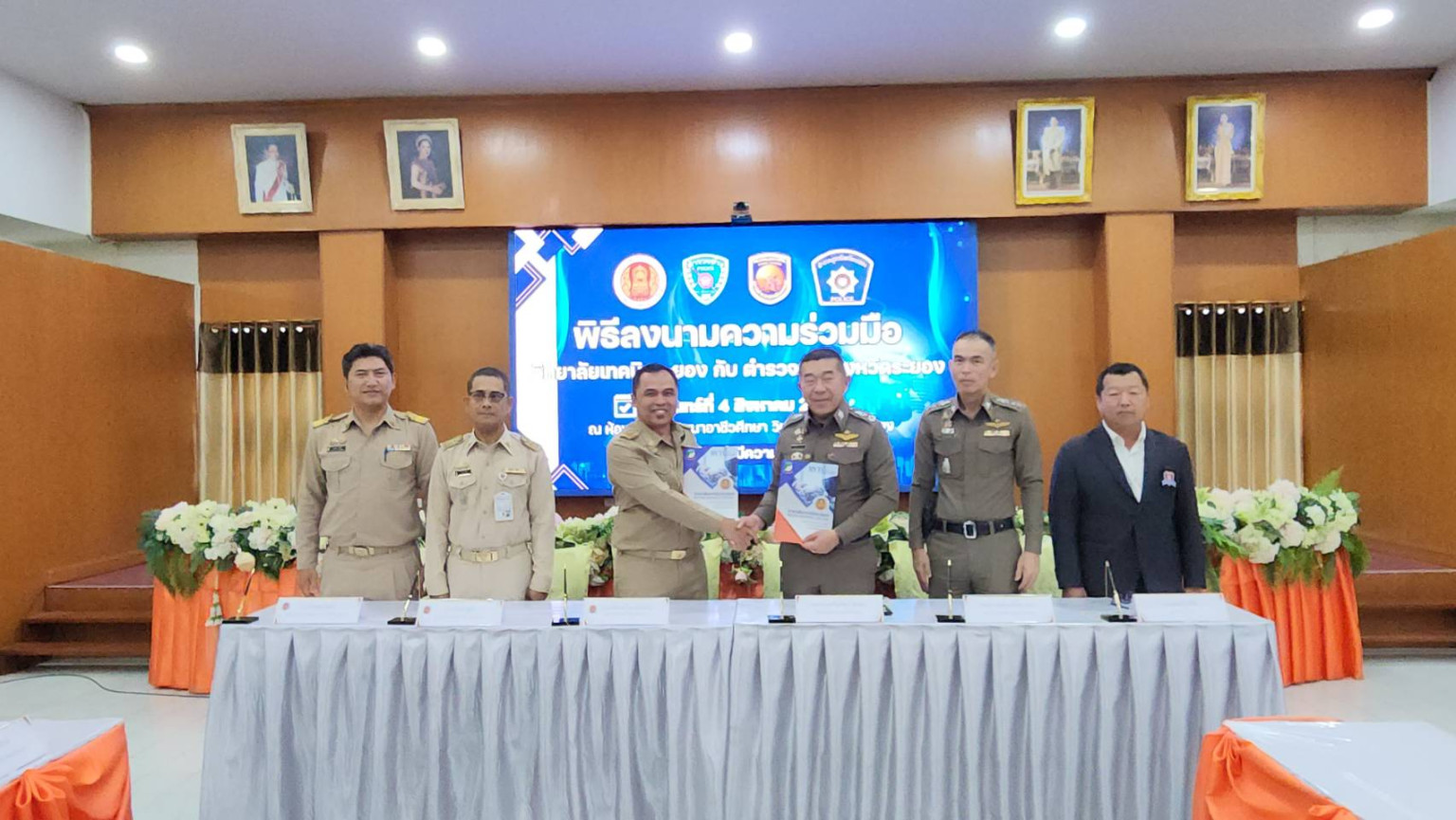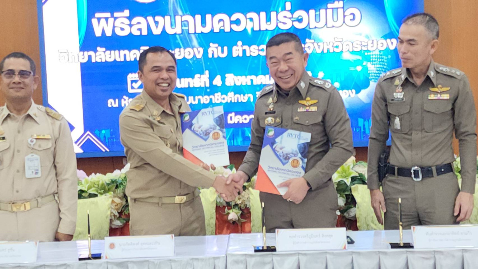 เมื่อเวลา 09.30 น. วันที่ 4 ส.ค.68 ที่ห้องสัมมนาอาชีวศึกษา อาคารอำนวยการ ชั้น 3 วิทยาลัยเทคนิคระยอง ต.ท่าประดู่ อ.เมือง จ.ระยอง ผู้สื่อข่าวรายงานว่า นายกิตติพงค์ อุตตมะเวทิน ผอ. วิทยาลัยเทคนิคระยอง พร้อมด้วย ดร.ชรินทร์ ชูชื่น นางณัฐธารีย์ สิริกุลปัญญาพร นายชาคริต รุ่งรัตน์ รอง ผอ. วิทยาลัยเทคนิคระยอง ลงนาม MOU ความร่วมมือจัดการศึกษาอาชีวศึกษาระบบทวิภาคี เพื่อร่วมพัฒนาคนสมรรถนะสูง สร้างอาชีพที่ทันสมัยด้วยนวัตกรรมและเทคโนโลยีกับ พล.ต.ต.ภูมินทร์ สิงหสุต ผบก.ภ.จว.ระยอง พ.ต.อ.อาทิตย์ ยาแก้ว ผกก.สภ.เมืองระยอง และนายสุขพล โตวิชัย ประธานตำรวจช่าง สภ.เมืองระยอง ในการส่งนักเรียน นักศึกษา เข้าร่วมโครงการตำรวจช่าง (ช่วยเหลือ ปชช.และนักท่องเที่ยว)