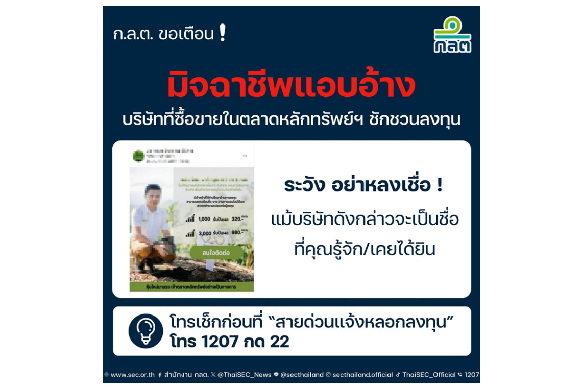 ก.ล.ต.เตือนมิจฉาชีพแอบอ้างบริษัทที่ซื้อขายใน ตลท.ชักชวนลงทุน อย่าหลงเชื่อ
