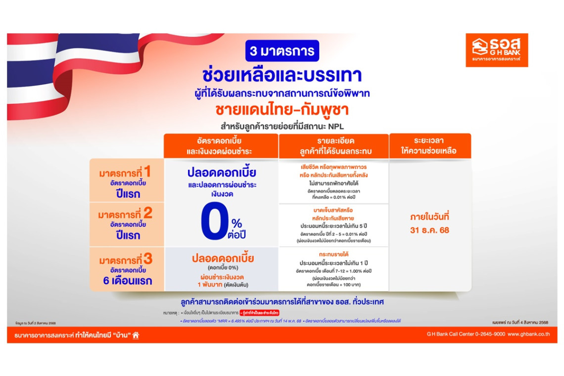 ทั้งนี้ผู้ที่ต้องการเข้าร่วมมาตรการช่วยเหลือและบรรเทาผู้ที่ได้รับผลกระทบจากสถานการณ์พิพาทชายแดนไทย – กัมพูชา สามารถติดต่อขอเข้าร่วมมาตรการได้ที่สาขาธนาคารได้ตั้งแต่วันนี้ถึงวันที่ 31 ธันวาคม 2568 พร้อมแสดงหลักฐานที่ได้รับผลกระทบจากการประกอบอาชีพ / ธุรกิจ / การค้าจากสถานการณ์ข้อพิพาทชายแดน อาทิ หลักฐานรายได้ หรือหนังสือรับรองจากหน่วยงานต้นสังกัด ภาพถ่ายกิจการ หรืออื่น ๆ ที่แสดงให้เห็นว่าได้รับผลกระทบดังกล่าวอย่างชัดเจน และเอกสารต่าง ๆ เพื่อนำมาประกอบการพิจารณา สอบถามรายละเอียดเพิ่มเติมได้ที่ ธอส.ทุกสาขาทั่วประเทศ หรือ G H Bank Call Center โทร.0-2645-9000 หรือ Facebook Fanpage ธนาคารอาคารสงเคราะห์ และติดตามข่าวสารของธนาคารได้ที่ Application : GHB ALL GEN และ www.ghbank.co.th