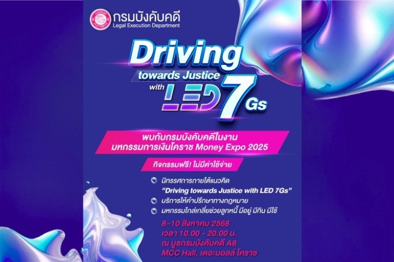 กรมบังคับคดี กระทรวงยุติธรรม เชิญชวนประชาชนร่วมงาน มหกรรมการเงินโคราช ครั้งที่ 19 Money Expo 2025 ระหว่างวันที่ 8 – 10 สิงหาคม 2568 ณ MCC Hall เดอะมอลล์ โคราช พบกับบูธ กรมบังคับคดี ภายใต้แนวคิด “บังคับคดีเชิงรุก สร้างสุขแก่ประชา นำพาความยุติธรรม” หรือ “Driving towards Justice with LED 7Gs” ที่มุ่งให้ความรู้และบริการด้านกฎหมายอย่างครอบคลุม