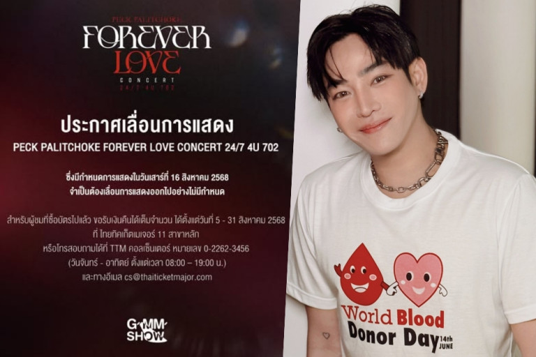 ล่าสุดวันนี้ (4 ส.ค.68) เพจ GMM SHOW ได้โพสต์ข้อความว่า ประกาศเลื่อนการแสดง "PECK PALITCHOKE FOREVER LOVE CONCERT 24/7 4U 702" ซึ่งมีกำหนดการแสดงในวันเสาร์ที่ 16 สิงหาคม 2568 ออกไปอย่างไม่มีกำหนด สำหรับผู้ที่ซื้อบัตรไปแล้ว สามารถขอคือเงินเต็มจำนวน ได้ตั้งแต่วันที่ 5 - 31 สิงหาคม 2568 ที่ ไทยทิคเก็ตเมเจอร์ 11 สาขาหลัก