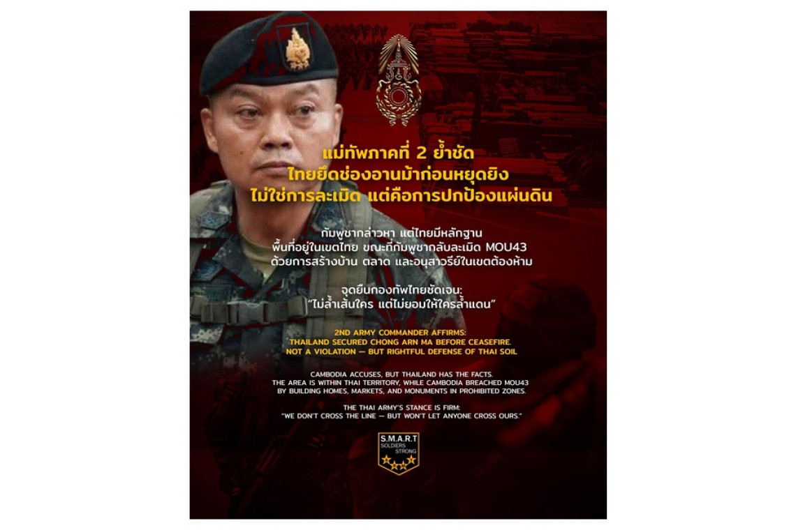 “แม่ทัพภาคที่ 2” ยืนยันไทยยึด “ช่องอานม้า” ก่อนมีมติหยุดยิง ไม่ใช่การละเมิดตอบโต้คำแถลงบิดเบือนของโฆษกกลาโหมกัมพูชา