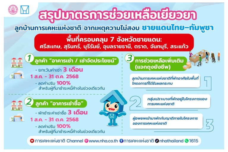 วันที่ 4 ส.ค.68 นายทวีพงษ์ วิชัยดิษฐ ผู้ว่าการการเคหะแห่งชาติ เปิดเผยว่า การเคหะแห่งชาติพร้อมยืนเคียงข้างประชาชนในยามวิกฤติ ด้วยมาตรการช่วยเหลืออย่างเป็นรูปธรรม เพื่อบรรเทาภาระค่าใช้จ่ายด้านที่อยู่อาศัย และส่งเสริมความมั่นคงในการดำรงชีวิตของผู้ได้รับผลกระทบมาตรการเร่งด่วนให้ลูกบ้านของการเคหะแห่งชาติใน 7 จังหวัดชายแดน ได้แก่ ศรีสะเกษ สุรินทร์ บุรีรัมย์ อุบลราชธานี ตราด จันทบุรี และสระแก้ว ครอบคลุมความช่วยเหลือหลัก 3 ด้าน ได้แก่ 1. ยกเว้นค่าเช่ารายย่อยและเช่าจัดประโยชน์สำหรับลูกค้าการเคหะแห่งชาติ ฟรีค่าเช่า 3 เดือน ตั้งแต่ 1 สิงหาคม – 31 ตุลาคม 2568 รวมถึงยกเว้นค่าปรับ 100% สำหรับผู้ที่มาชำระหนี้ค้าง ในช่วงเวลาดังกล่าว 2. พักชำระหนี้กลุ่มเช่าซื้อ ลูกค้าเช่าซื้ออาคารของการเคหะแห่งชาติในพื้นที่ที่ได้รับผลกระทบ จะได้รับสิทธิพักชำระค่าเช่าซื้อ 3 เดือน ตั้งแต่ 1 สิงหาคม – 31 ตุลาคม 2568 พร้อมยกเว้นค่าปรับ 100% กรณีที่มาชำระหนี้ค้างเช่นเดียวกัน 3. สนับสนุนการยังชีพ การเคหะแห่งชาติได้จัดเตรียมถุงยังชีพเพื่อช่วยเหลือ 3 กลุ่มหลัก ได้แก่ 1) ลูกค้าที่พักอาศัยในโครงการของการเคหะแห่งชาติในพื้นที่ชายแดน 2) กลุ่มเปราะบางที่อยู่ในโครงการ 3) ผู้ที่อพยพเข้ามาพักอาศัยกับญาติในโครงการเนื่องจากสถานการณ์ความไม่สงบดังกล่าว