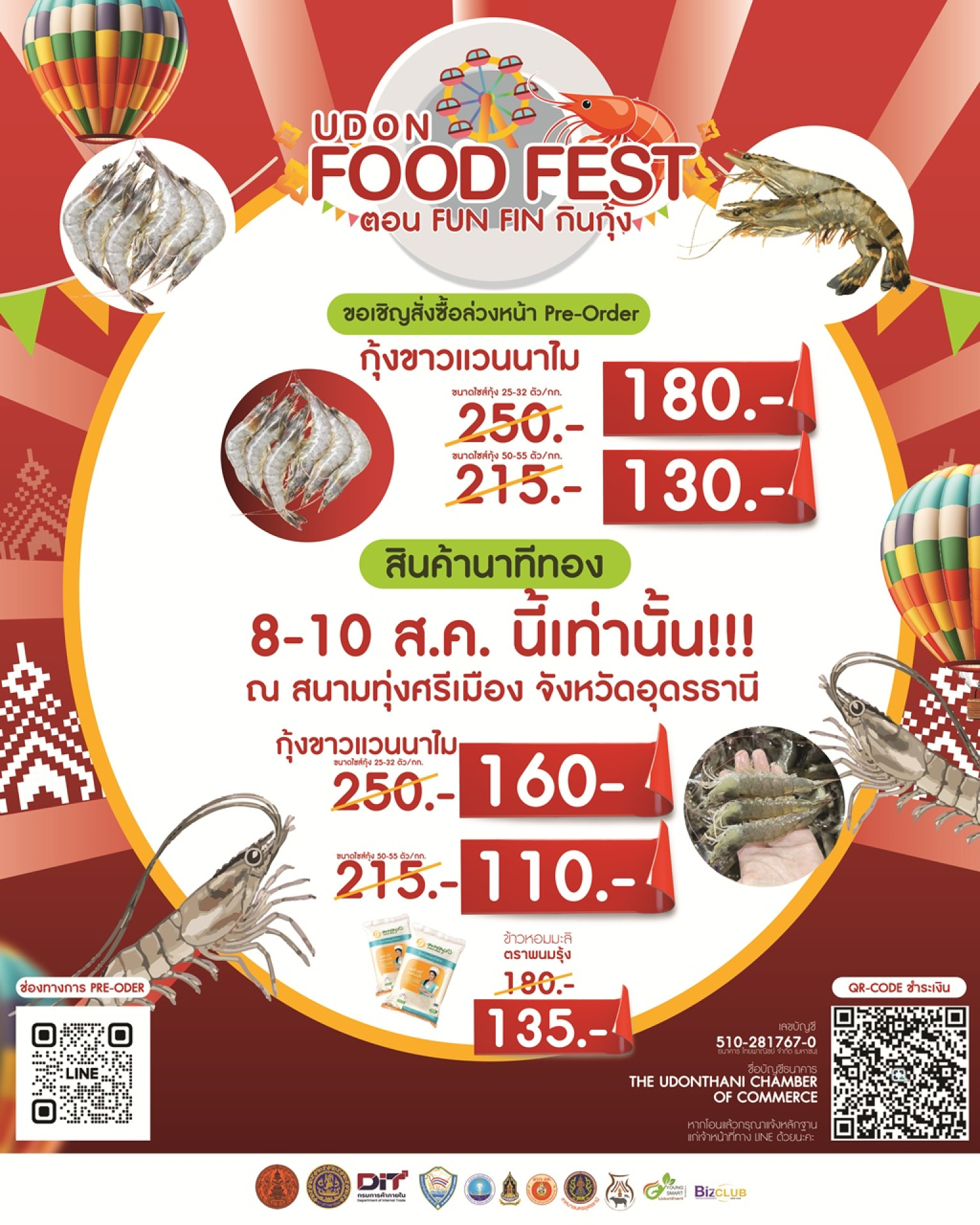 วันที่ 5 ส.ค.68 นายกัณฑ์พงศ์ สุระวรรณวิจิตร ประธานหอการค้าจังหวัดอุดรธานี เปิดเผยว่า หอการค้าจังหวัดอุดรธานี ได้ร่วมกับ สำนักงานพาณิชย์จังหวัดอุดรธานี จัดกิจกรรมรณรงค์การบริโภคสินค้ากุ้ง ภายในประเทศ ภายใต้โครงการพัฒนาและส่งเสริมศักยภาพการแข่งขันสินค้าประมง ปี 2568 โดยใช้ชื่องาน “UDON FOOD FEST” (FUN FIN กินกุ้ง) ระหว่างวันที่ 8 - 17 สิงหาคม 2568 ณ บริเวณสนามทุ่งศรีเมืองอุดรธานี โดยมีวัตถุประสงค์ เพื่อเพิ่มช่องทางการตลาดและขยายโอกาสทางการค้าให้แก่ผู้ประกอบการในกลุ่มสินค้าอาหารและเครื่องดื่ม รวมถึงสินค้า Non-Food สินค้าเกษตร โดยภายในงานมีการจำหน่ายสินค้ากุ้งแวนนาไม ในราคาพิเศษกว่าท้องตลาดและสินค้านาทีทอง รวมถึงอาหารที่ทำจากกุ้ง พร้อมกิจกรรมไฮไลต์ “แข่ง” แข่งขันกินกุ้ง สินค้าเกษตรแปรรูป สินค้าออร์แกนิก สินค้าเพื่อความยั่งยืน อาหารสำเร็จรูป และอาหารแห่งอนาคต ผ่อนคลายกับบรรยากาศสตรีทฟู้ด รวมเมนูเด็ดจากร้านดังของจังหวัดอุดรธานี และเพื่อเป็นการช่วยเกษตรกร (ต้นน้ำ) จากจังหวัดฉะเชิงเฉา และเป็นการรักษาเสถียรภาพราคาสินค้ากุ้ง โดยการเชื่อมโยงมายังจังหวัดอุดรธานีและจังหวัดใกล้เคียง จัดกิจกรรมส่งเสริมการขายดังรายละเอียดดังนี้