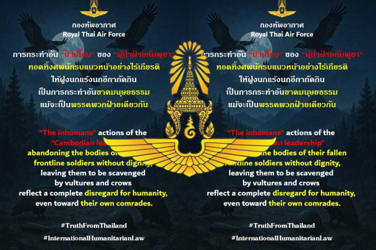 The Royal Thai Armed Forces strongly condemn the Cambodian authorities for abandoning the bodies of their fallen soldiers on the battlefield. Such an inhumane act constitutes a grave violation of international law. Those who have fallen in combat deserve to be treated with honor and dignity — not left to decay in the open. Their families are forced to endure profound sorrow, having been denied even the final opportunity to say farewell.
