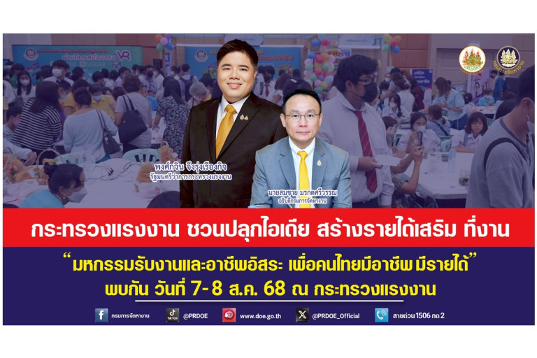 ทั้งนี้ ขอเชิญนักเรียน นักศึกษา และประชาชนทั่วไปที่กำลังมองหาโอกาสในการประกอบอาชีพอิสระ เข้าร่วมงาน “มหกรรมรับงานและอาชีพอิสระ เพื่อคนไทยมีอาชีพ มีรายได้” ซึ่งจะจัดขึ้นในวันที่ 7–8 สิงหาคม 2568 ณ ชั้น 1 อาคารกระทรวงแรงงาน ถนนมิตรไมตรี แขวงดินแดง เขตดินแดง กรุงเทพมหานคร สอบถามรายละเอียดเพิ่มเติมได้ที่ สายด่วนกระทรวงแรงงาน โทร. 1506 กด 2 กรมการจัดหางาน หรือ สายด่วนกรมการจัดหางาน โทร. 1694