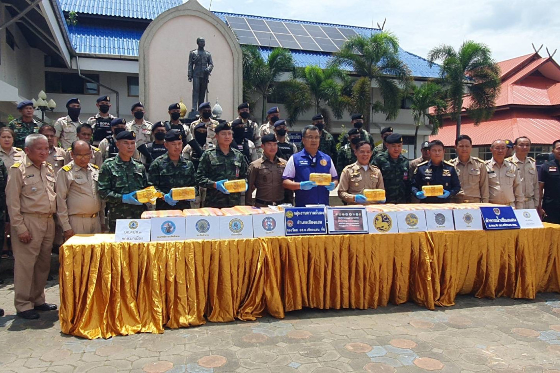 เวลา 13.30 น. วันที่ 5 สิงหาคม 2568 ที่ลานหน้าที่ว่าการอำเภอเชียงแสน จังหวัดเชียงราย นายชรินทร์ ทองสุข ผู้ว่าราชการจังหวัดเชียงราย มอบหมายให้ นายสุพจน์ แสนมี ปลัดจังหวัดเชียงราย พันเอก กิตติ นาใจ รองผู้บังคับหน่วยเฉพาะกิจทัพเจ้าตาก กองกำลังผาเมือง นายคฑาสิทธิ์ เนื่องหล้า นายอำเภอเชียงแสน พันตำรวจเอก อนุพันธ์ กันถารัตน์ ผู้กำกับการสถานีตำรวจภูธรเชียงแสน ฝ่ายปกครอง พร้อมด้วยหน่วยงานที่เกี่ยวข้องได้ร่วมกันแถลงข่าวการสกัดกั้นการลำเลียงยาบ้า จำนวนประมาณ 2,500,000 เม็ด