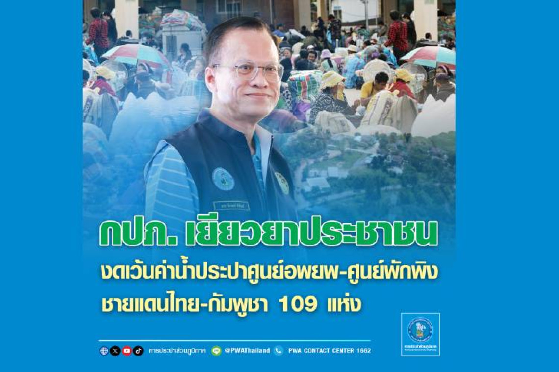 การประปาส่วนภูมิภาค (กปภ.) เยียวยาประชาชนและผู้ได้รับผลกระทบจากสถานการณ์ชายแดนไทย-กัมพูชา งดเว้นค่าน้ำประปาเดือนกรกฎาคม 2568 (ใบแจ้งค่าน้ำประปาเดือนสิงหาคม 2568)ให้กับศูนย์อพยพ-ศูนย์พักพิง ที่เป็นผู้ใช้น้ำของ กปภ. ใน 7 จังหวัดชายแดนไทย-กัมพูชา 109 แห่ง