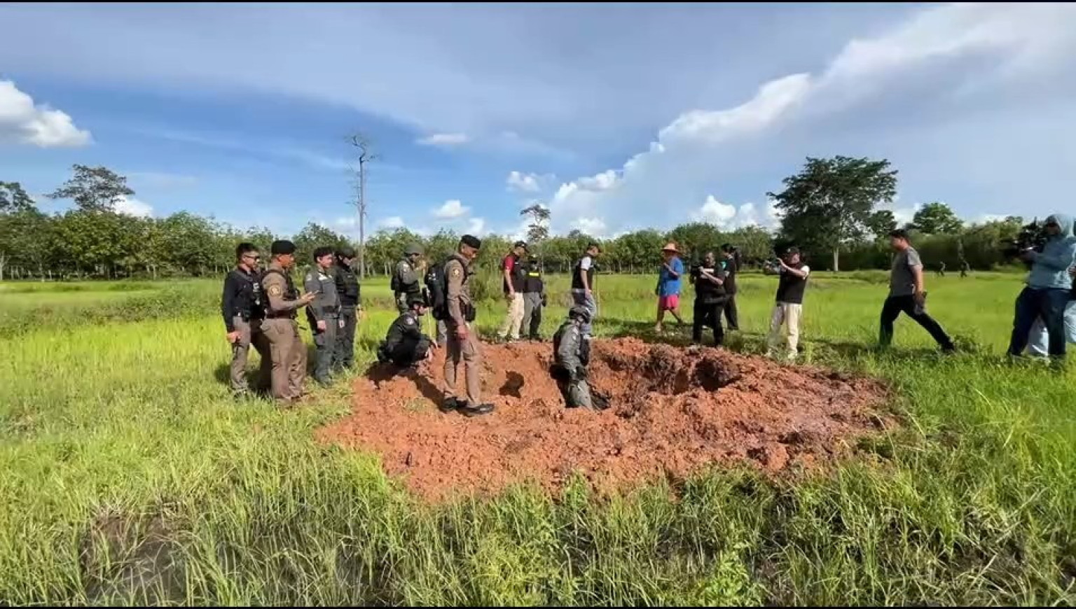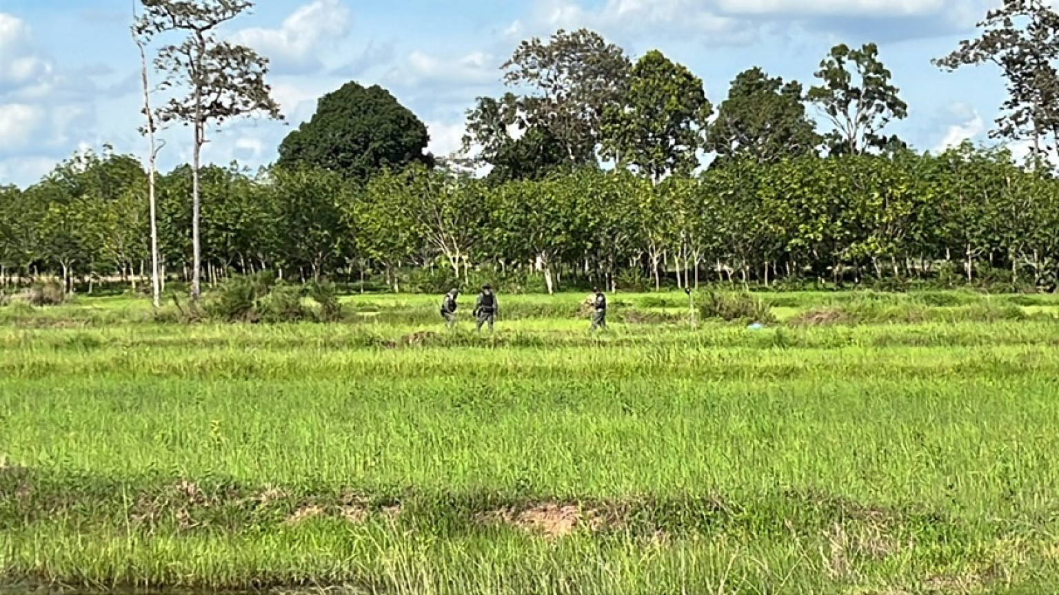 วันที่ 5 สิงหาคม 68 ผู้สื่อข่าวรายงาน ว่า ที่ อ.พนมดงรัก จ.สุรินทร์ ชุดเก็บกู้พิสูจน์ทราบและทำลายวัตถุระเบิด กองกำกับการตำรวจตระเวนชายแดนที่ 21 ร่วมกับชุดเก็บกู้วัตถุระเบิดแห่งชาติ หรือ TMAX และนายอำเภอพนมดงรัก เจ้าหน้าที่ตำรวจ สภ.พนมดงรัก ได้ลงพื้นที่จุดเดิมที่พบลูกจรวด Bm-21 ตกลงกลางทุ่งนาบ้านหนองแคน ตำบลจีกแดก และยังไม่ทำงาน ลูกจรวดฝั่งลึกหลายเมตร ยากต่อการเก็บกู้ทำลาย และวันนี้ จนท.ชุด EOD ได้วางแผนตรวจสอบเก็บกู้ทำลายอีกครั้ง จนประสบผลสำเร็จ พื้นที่ปลอดภัย