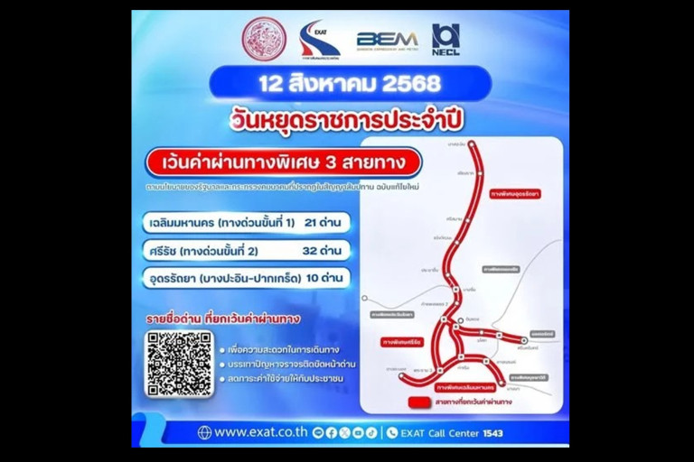 เมื่อวันที่ 10 ก.พ.68 การทางพิเศษแห่งประเทศไทย (กทพ.) กระทรวงคมนาคม ยกเว้นค่าผ่านทางพิเศษ วันอังคารที่ 12 สิงหาคม 2568 (วันเฉลิมพระชนมพรรษาสมเด็จพระนางเจ้าสิริกิติ์ พระบรมราชินีนาถ พระบรมราชชนนีพันปีหลวง และวันแม่แห่งชาติ) จำนวน 1 วัน รวม 3 สายทาง ดังนี้