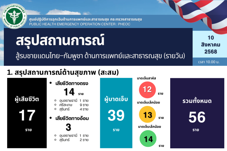 เมื่อวันที่ 10 ส.ค.68 ศูนย์ปฏิบัติการฉุกเฉินด้านการแพทย์และสาธารณสุข กระทรวงสาธารณสุข สรุปสถานการณ์สู้รบชายแดนไทย-กัมพูชา (ฝ่ายพลเรือน) ด้านการแพทย์และสาธารณสุข (รายวัน) ณ เวลา 10.00 น. ยอดผู้เสียชีวิตยังคงที่ 17 ราย แบ่งเป็นผู้เสียชีวิตทางตรง 14 ราย และผู้เสียชีวิตทางอ้อม 3 ราย ส่วนจำนวนผู้บาดเจ็บสะสมมีทั้งหมด 39 ราย โดยมีผู้ที่รักษาอาการดีขึ้นและกลับบ้านแล้ว 3 ราย แต่ยังมีผู้บาดเจ็บที่รักษาตัวในโรงพยาบาล 3 ราย ซึ่งมีอาการสาหัส โดยได้รับการรักษาในโรงพยาบาลสรรพสิทธิประสงค์ 1 ราย โรงพยาบาลศรีสะเกษ 1 ราย และโรงพยาบาลสุรินทร์ 1 ราย