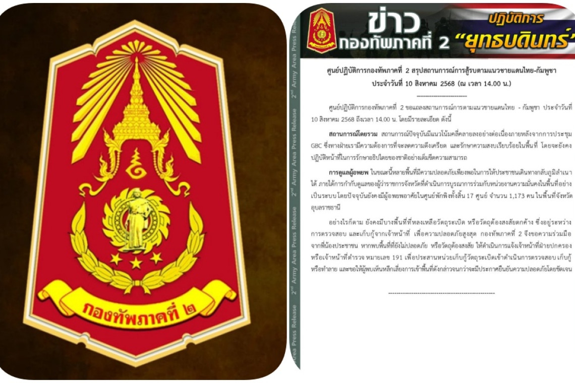 ศูนย์ปฏิบัติการกองทัพภาคที่ 2 ขอแถลงสถานการณ์การตามแนวชายแดนไทย - กัมพูชา ประจำวันที่ 10 สิงหาคม 2568 ถึงเวลา 14.00 น. โดยมีรายละเอียด ดังนี้