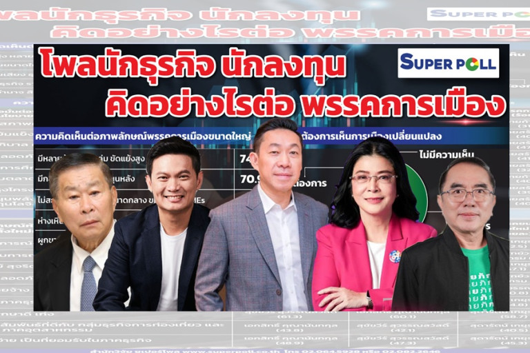 วันที่ 17 ส.ค.2568 สำนักวิจัยซูเปอร์โพล เปิดเผยรายงานผลสำรวจเรื่อง โพลนักธุรกิจ นักลงทุน คิดอย่างไรต่อ พรรคการเมือง จากกลุ่มตัวอย่างนักธุรกิจ นักลงทุน ในภาคอุตสาหกรรมท่องเที่ยว บริการ การค้า และการผลิตทั่วประเทศจำนวน 450 ตัวอย่าง ระหว่างวันที่ 10 - 16 ส.ค.2568