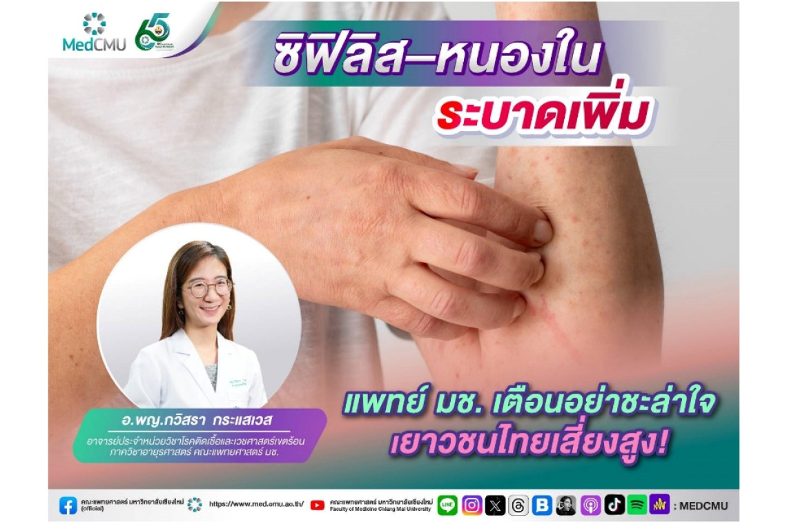 อ.พญ.กวิสรา กระแสเวส อาจารย์ประจำหน่วยวิชาโรคติดเชื้อและเวชศาสตร์เขตร้อน ภาควิชาอายุรศาสตร์ คณะแพทยศาสตร์ มช. เปิดเผยว่า “จากข้อมูลของกองระบาดวิทยา กรมควบคุมโรค พบว่าสถานการณ์ล่าสุดปี 2568 มีอัตราการติดเชื้อซิฟิลิสในประเทศไทยเพิ่มขึ้นต่อเนื่อง โดยมีผู้ป่วยรายใหม่กว่า 22,870 ราย หรือคิดเป็น 35.2 รายต่อประชากรแสนคน เพิ่มขึ้นถึง 80% เมื่อเทียบกับปี 2565 ซึ่งพบเพียง 12,296 ราย กลุ่มเพศชายพบการติดเชื้อสูงกว่าเพศหญิงเล็กน้อย ขณะที่จังหวัดเชียงใหม่ยังคงติดอันดับต้น ๆ ของประเทศ