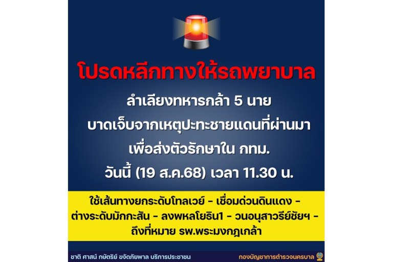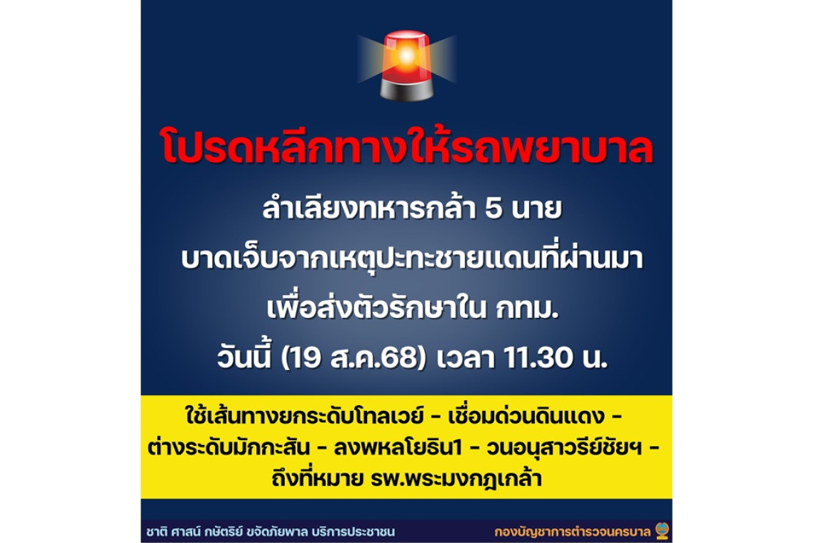 ลำเลียงทหารกล้า 5 นาย บาดเจ็บจากเหตุปะทะชายแดนที่ผ่านมา เพื่อส่งตัวรักษาใน กทม.