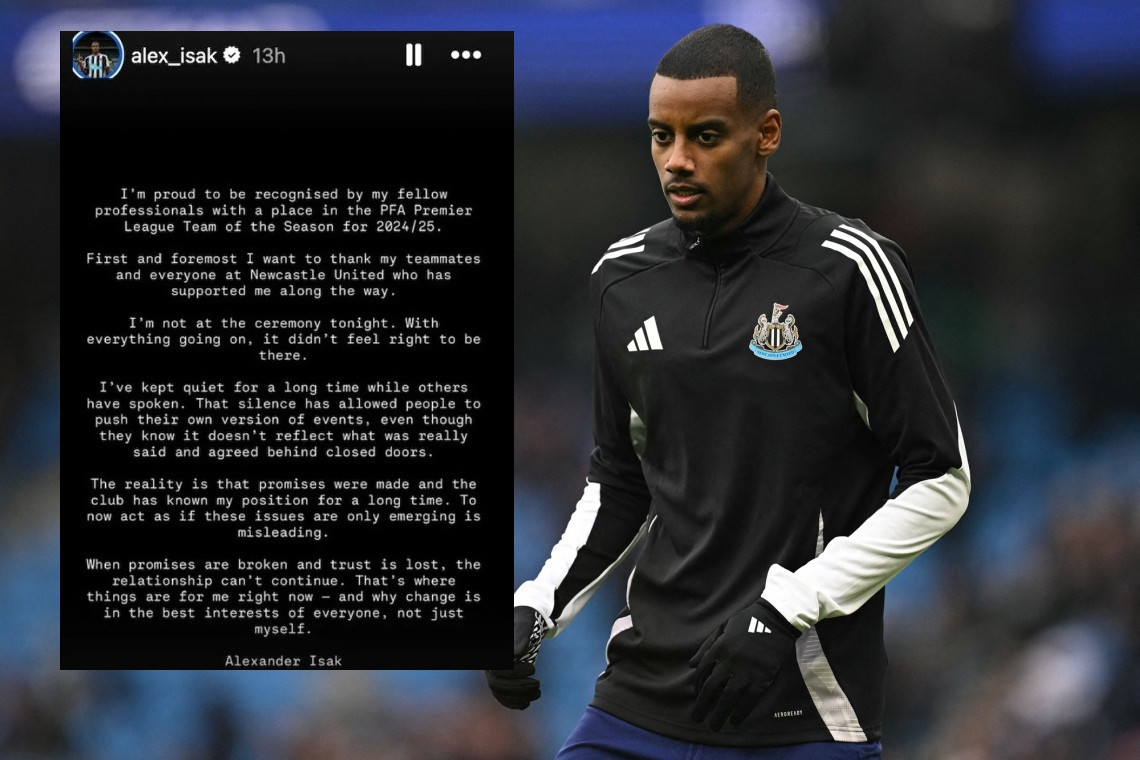 ในโพสต์อินสตาแกรมเมื่อคืนวันอังคารที่ผ่านมา อิซัค ผู้ทำไปถึง 23 ประตูในพรีเมียร์ลีก ฤดูกาล 2024/25 ระบุว่า "เขารู้สึกไม่เหมาะสมที่จะเข้าร่วมพิธีมอบรางวัล PFA แม้จะถูกเลือกติดทีมยอดเยี่ยมประจำปี เนื่องจากมีปัญหาที่กำลังดำเนินอยู่ พร้อมเผยว่าความไว้วางใจระหว่างเขากับสโมสรได้ “สูญเสียไปแล้ว”