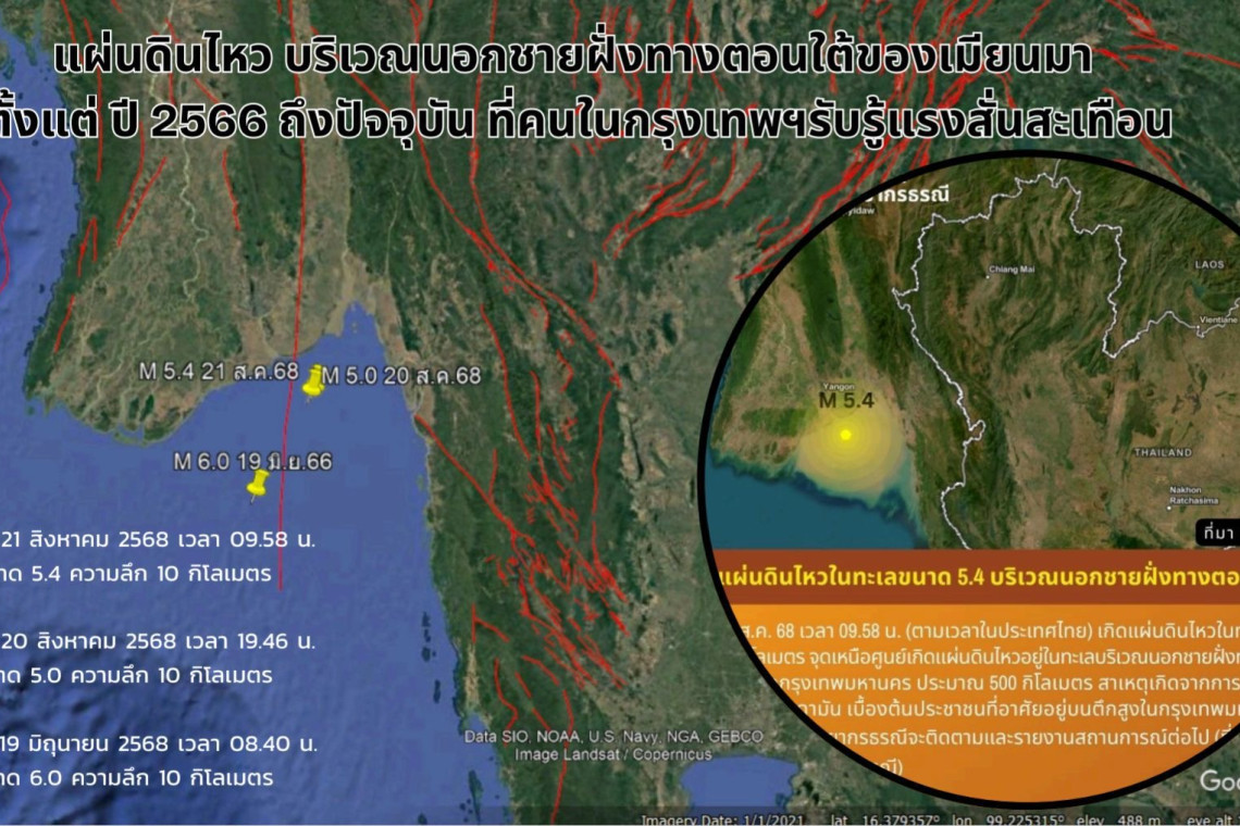 วันที่ 21 ส.ค.68 ที่กรมทรัพยากรธรณี นายพิชิต สมบัติมาก อธิบดีกรมทรัพยากรธรณี กล่าวถึงเหตุการณ์แผ่นดินไหวที่เกิดขึ้นเมื่อเวลา 09.58 น. (ตามเวลาประเทศไทย) ของวันนี้ว่า แผ่นดินไหวดังกล่าวเกิดขึ้นบริเวณนอกชายฝั่งทางตอนใต้ของประเทศเมียนมา ที่ละติจูด 16.145° องศาเหนือ ลองจิจูด 96.686 องศาตะวันออกขนาด 5.4 ความลึก 10 กิโลเมตร ทางทิศตะวันตกเฉียงใต้ของ อ.แม่สอด จ.ตาก ประมาณ 211 กิโลเมตรและห่างจากกรุงเทพมหานคร ประมาณ 500 กิโลเมตร ไม่มีรายงานความเสียหาย แต่ประชาชนที่อาศัยอยู่บนตึกสูงในกรุงเทพมหานครรับรู้ถึงแรงสั่นสะเทือนเล็กน้อย