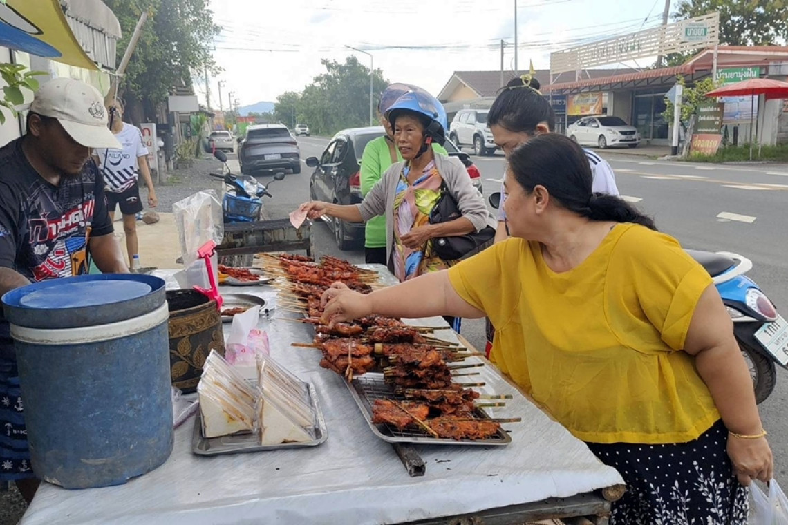 วันที่ 25 ส.ค.68 ผู้สื่อข่าวรายงานว่า บ้านเลขที่ 158 หมู่ 6 ต. ศรีนาวา อ.เมือง จ.นครนายก ได้มีควันโขมงเหมือนไฟไหม้บริเวณร้านค้าข้างทางแต่พอลองเข้าไปดูที่แท้เค้าย่างไก่กันควันโขมงใครผ่านไปผ่านมาต้องแวะซื้อ บริเวณบ้านหลังดังกล่าวเปิดเป็นร้าค้าเล็กๆ ติดถนนมีลูกค้าเข้ามาซื้อไก่ย่างกันไม่ขาดระยะเพราะที่นี่มีลักษณะเด่นใช้ควันเรียกลูกค้า และได้พบกับนางปองจิต ทองสุข อายุ59 ปี กำลังย่างไก่วันโขมงโฉงเฉงอยู่พร้อมเล่าให้ฟังว่า ตนเองอยู่กับลูกๆหลานๆกัน 4 คน ซึ่งทุกวันก็จะไปซื้อไก่สดเอามาทำไก่ย่าง วันละ 400 - 500 ไม้ ช่วยกันขายเปิดขายตั้งแต่ บ่าย 3 โมง ปิดก็แค่ 5 โมงเย็น ขายมานานกว่า 4 ปี กำไรก็พออยู่ได้พอเลี้ยงลูกเลี้ยงหลาน ที่แปลกและดูน่ากินก็คือไก่ย่างที่เรามัดปลายไม้นั้นไม่ได้ใช่ลวดมัดเราใช้ก้านตองมัด เวลาลูกค้าซื้อไม่ต้องไปแกะลวดออกแค่หยับออกงาายไม่เป็นอันตรายด้วย ลูกค้าที่มาซื้อเค้าจะรู้กันดีถ้าวันไหนมีควันแสดงว่าร้านเปิดแต่ที่ร้านก็ไม่เคยหยุดนอกจากจะมีธุระจำเป็นจริงๆ