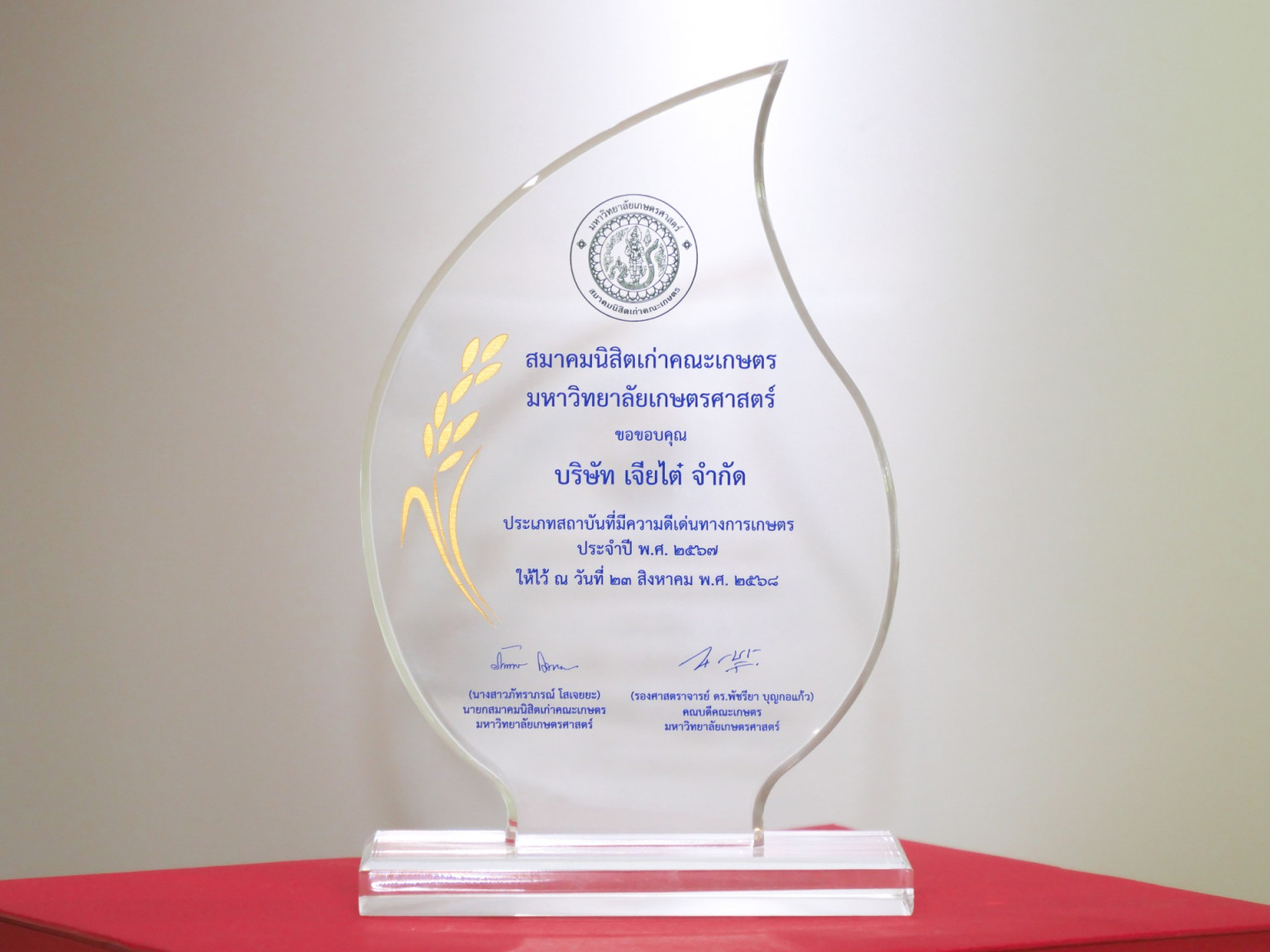 บริษัท เจียไต๋ จำกัด ผู้นำธุรกิจนวัตกรรมการเกษตรของไทย โดยคุณทวีสุข เมฆธวัชชัยกุล Chief Commercial Officer เป็นตัวแทนรับโล่รางวัลเชิดชูเกียรติ “สถาบันที่มีความดีเด่นทางการเกษตร พ.ศ. 2567” ในพิธีมอบรางวัล “นิสิตเก่าดีเด่น คณะเกษตร บุคคลดีเด่นทางการเกษตร และสถาบันดีเด่นทางการเกษตร พ.ศ. 2567” ภายในงานรวงทองคืนทุ่ง 2568 – Aggie Day'68 จัดโดยสมาคมนิสิตเก่าคณะเกษตร มหาวิทยาลัยเกษตรศาสตร์ เมื่อวันที่ 23 สิงหาคม 2568 ณ อาคารวชิรานุสรณ์ คณะเกษตร โดยรางวัลนี้จัดขึ้นเพื่อเชิดชูองค์กรและบุคคลที่มีผลงานโดดเด่น เป็นที่ยอมรับในวงการเกษตร มีบทบาทสำคัญต่อการพัฒนาเกษตรกรรมของประเทศ และสร้างสรรค์กิจกรรมที่เป็นประโยชน์ต่อสังคม