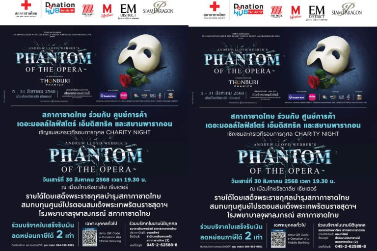 สภากาชาดไทย ชวนทุกท่านร่วมสัมผัสกับประสบการณ์ที่ตราตรึงใจกับละครเวทีรอบการกุศล Charity Night The Phantom of the Opera ละครเวทีระดับตำนานที่ครองใจผู้ชมทั่วโลกและยังได้ร่วมส่งมอบความหวังและโอกาสให้กับผู้ป่วยมะเร็งให้เข้าถึงการรักษาและมีคุณภาพชีวิตที่ดีขึ้นต่อไปผ่านการดำเนินงานของศูนย์โปรตอนสมเด็จพระเทพรัตนราชสุดาฯ โรงพยาบาลจุฬาลงกรณ์ สภากาชาดไทยวันเสาร์ที่ 30 ส.ค.68 เวลา 19.30 น.ที่เมืองไทยรัชดาลัย เธียเตอร์รายได้โดยเสด็จพระราชกุศลบำรุงสภากาชาดไทย สมทบทุนศูนย์โปรตอนสมเด็จพระเทพรัตนราชสุดาฯ โรงพยาบาลจุฬาลงกรณ์ สภากาชาดไทย ท่านใดสนใจสามารถบริจาคและจองที่นั่งได้ที่คุณวาสนา 094 555 9961 หรือสามารถร่วมบริจาคสมทบทุนได้ที่ ผ่านบัญชี ธนาคารไทยพาณิชย์ สาขาสภากาชาดไทย ชื่อบัญชี สำนักงานจัดหารายได้ สภากาชาดไทย (2) ประเภทบัญชี ออมทรัพย์ เลขที่บัญชี 045-2-62588-8
