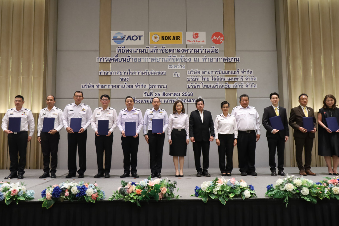 วันที่ 25 สิงหาคม 2568 นางสาวปวีณา จริยฐิติพงศ์ รักษาการผู้อำนวยการใหญ่ บริษัท ท่าอากาศยานไทย จำกัด (มหาชน) (AOT) เป็นประธานในพิธีลงนามบันทึกข้อตกลงความร่วมมือการเคลื่อนย้ายอากาศยานที่ขัดข้องระหว่างท่าอากาศยานในความรับผิดชอบของ AOT กับ บริษัท สายการบินนกแอร์ จำกัด บริษัท ไทย ไลอ้อน เมนทารี จํากัด และ บริษัท ไทยแอร์เอเชีย เอ็กซ์ จํากัด เมื่อวันที่ 25 สิงหาคม 2568 โดยมีวัตถุประสงค์เพื่อบูรณาการความร่วมมือระหว่างผู้ดำเนินการเดินอากาศ และผู้ดำเนินการสนามบินในด้านการให้บริการโดยคำนึงถึงความปลอดภัยเป็นสำคัญ รองรับสถานการณ์ฉุกเฉินได้อย่างต่อเนื่องและมีประสิทธิภาพ ซึ่งจะนำไปสู่ปฏิบัติการตามแผนฉุกเฉิน ที่ได้รับการรับรองจากรัฐเพื่อให้เกิดความปลอดภัย และการช่วยเหลือกู้ภัยต่อผู้ประสบเหตุอย่างทันท่วงที ตลอดจนยกระดับขีดความสามารถการขนส่งทางอากาศที่ปลอดภัยตามมาตรฐานของสำนักงานการบินพลเรือนแห่งประเทศไทย (CAAT) และองค์การการบินพลเรือนระหว่างประเทศ (ICAO)