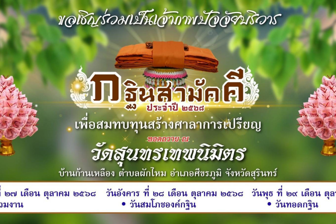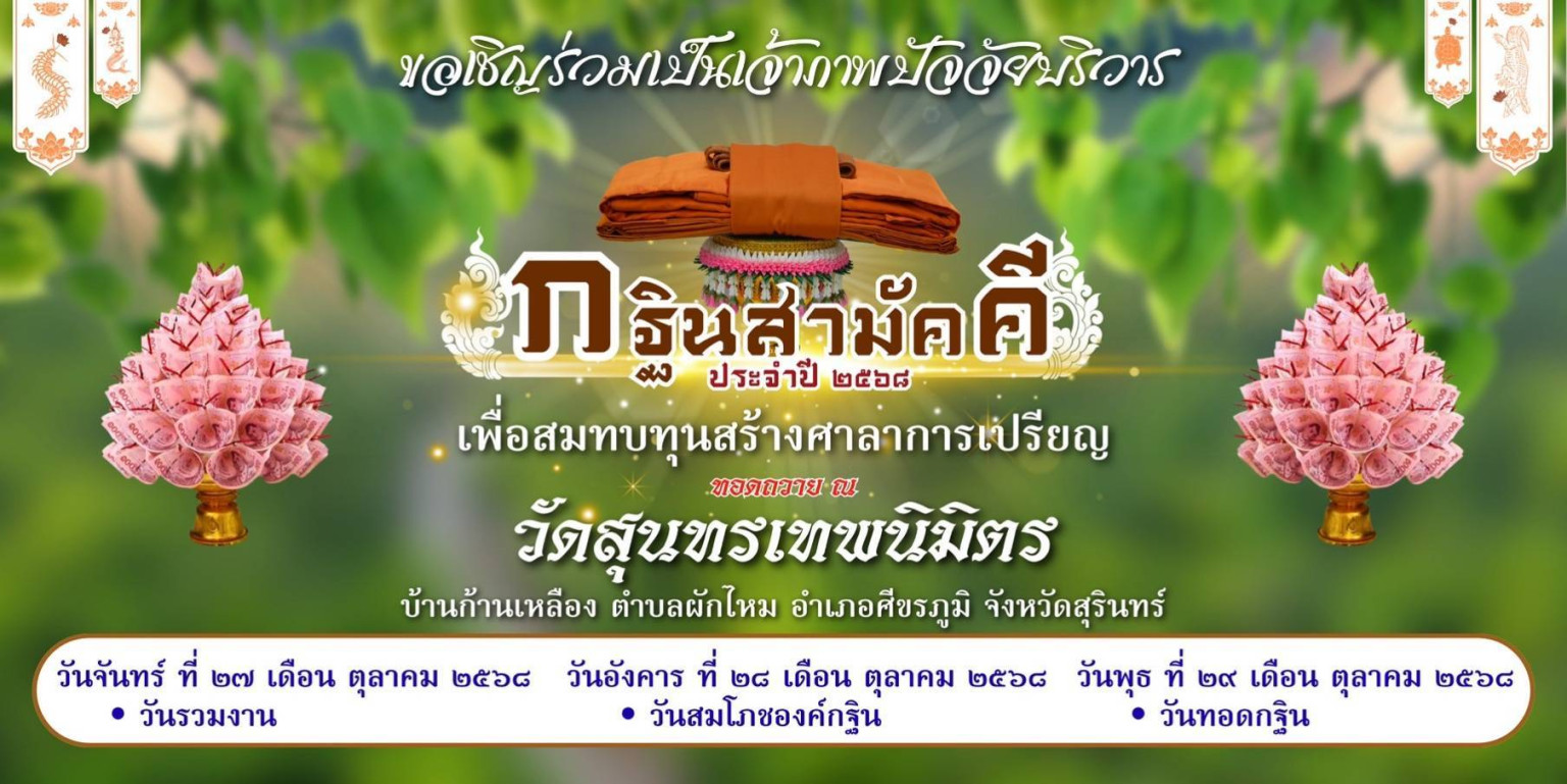ขอเชิญร่วมเป็นจ้าภาพกฐินสามัคคี ประจำปี ๒๕๖๘ เพื่อสมทบทุนสร้างศาลาการเปรียญ ทอดถวาย ณ วัดสุนทรเทพนิมิตร บ้านก้านเหลือง ตำบลผักไหม อำเภอศีชธรภูมิ จังหวัดสุรินทร์