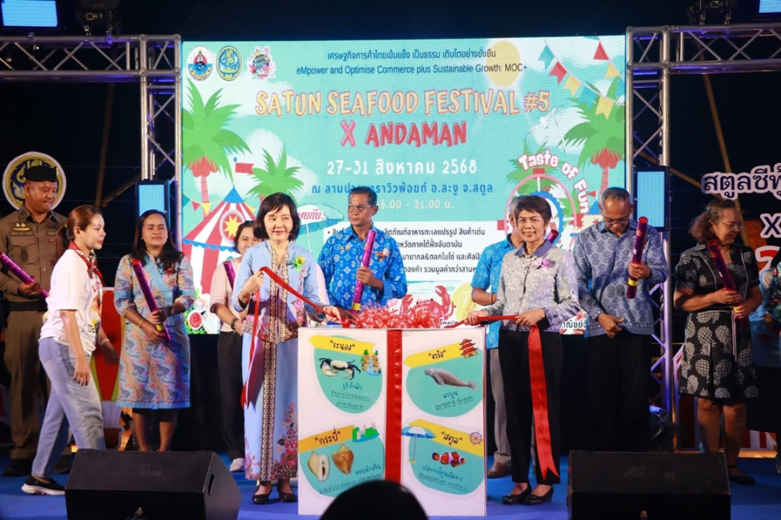 เมื่อวันที่ 27 ส.ค.68 นางสาวดุษฏี พฤกษเศรษฐ รองผู้ว่าราชการจังหวัดสตูล เป็นประธานในพิธีเปิดงาน “สตูล ซีฟู้ด เฟสติวัล ครั้งที่ 5 x อันดามัน” (Satun Seafood Festival ) โดยมี นางสายช่อ อังศุพานิช พาณิชย์จังหวัดสตูล เป็นผู้กล่าวรายงานถึงวัตถุประสงค์ของงาน ซึ่งเป็นส่วนหนึ่งของนโยบายกระทรวงพาณิชย์ที่มุ่งส่งเสริมการตลาดและสร้างโอกาสให้ผู้ประกอบการท้องถิ่นได้ขยายฐานลูกค้าและสร้างรายได้ให้เติบโตอย่างยั่งยืน