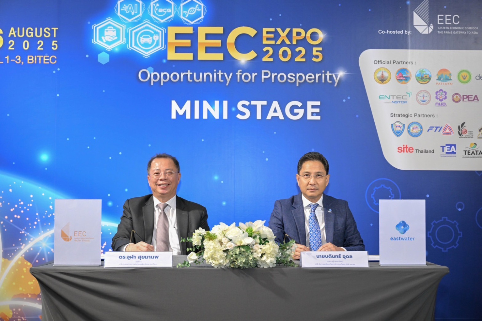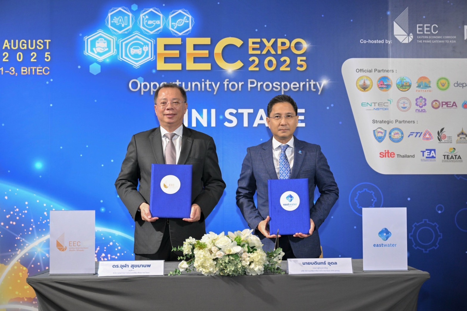นายบดินทร์ อุดล กรรมการผู้อำนวยการใหญ่ บริษัท จัดการและพัฒนาทรัพยากรน้ำภาคตะวันออก จำกัด (มหาชน) หรือ อีสท์ วอเตอร์ และนายจุฬา สุขมานพ เลขาธิการ สำนักงานคณะกรรมการนโยบายเขตพัฒนาพิเศษภาคตะวันออก (สกพอ.) ลงนามบันทึกข้อตกลงความร่วมมือ (MOU) เรื่อง “การส่งเสริมและสนับสนุนการพัฒนาเขตพัฒนาพิเศษภาคตะวันออก (อีอีซี)