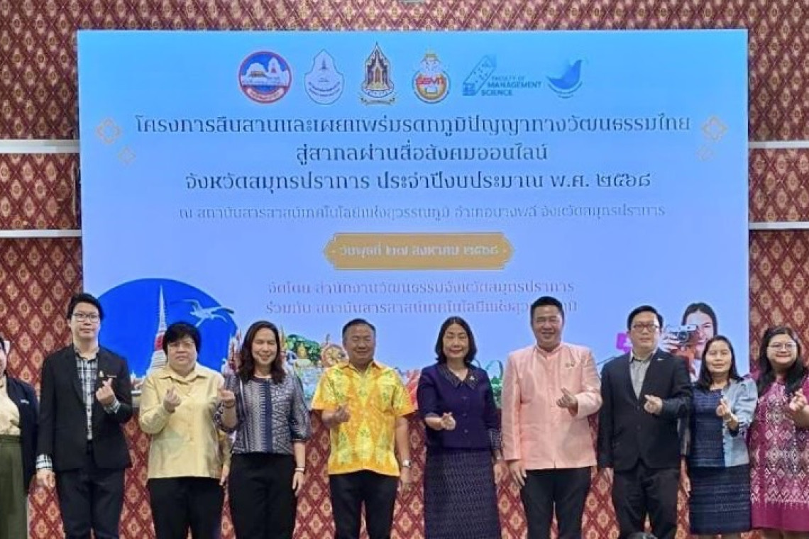 วันที่ 28 สิงหาคม 2568 สำนักงานวัฒนธรรมจังหวัด โดย นางอารีรัตน์ สุนทรเสนาะ ร่วมกับสถาบันสารสาสน์เทคโนโลยีแห่งสุวรรณภูมิ โดย ดร.อนุสรณ์ นามประดิษฐ์ จัดโครงการสืบสานและเผยแพร่มรดกภูมิปัญญาทางวัฒนธรรมไทยสู่สากลผ่านสื่อสังคมออนไลน์ จังหวัดสมุทรปราการ ประจำปีงบประมาณ 2568 ณ หอประชุมพิบูลย์สุวรรณภูมิ สถาบันสารสาสน์เทคโนโลยีแห่งสุวรรณภูมิ การจัดกิจกรรมครั้งนี้ได้รับเกียรติจากทีมวิทยากรจาก ผศ.ดร.สิงห์ สิงห์ขจร คณบดีและคณาจารย์คณะวิทยาการจัดการ มหาวิทยาลัยราชภัฎบ้านสมเด็จ เมื่อเร็ว ๆ นี้
