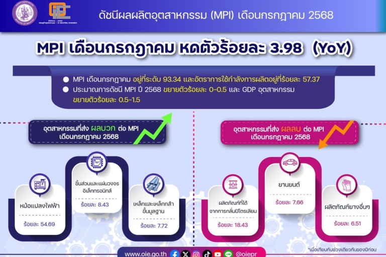 เมื่อวันที่ 28 ส.ค.68 นายภาสกร ชัยรัตน์ ผู้อำนวยการสำนักงานเศรษฐกิจอุตสาหกรรม (สศอ.) เปิดเผยว่า ดัชนีผลผลิตอุตสาหกรรม (MPI) เดือนก.ค. 68 อยู่ที่ระดับ 93.34 หดตัว 3.98% เมื่อเทียบกับช่วงเดียวกันของปีก่อน ด้านอัตราการใช้กำลังการผลิต (CapU) เดือน ก.ค. 68 อยู่ที่ 57.37%