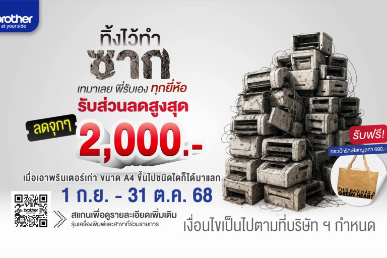 Brother ผู้นำโซลูชันด้านการพิมพ์จากประเทศญี่ปุ่น ชวนมาอัปเกรดเครื่องพิมพ์เก่าให้เป็นเครื่องใหม่ หรือคืนชีวิตให้ซากเครื่องพิมพ์เก่าให้กลับมาใช้งานได้อีกครั้ง ในแคมเปญ Trade-In สุดแรงแห่งปี "ทิ้งไว้ทำซาก – เทมาเลยพี่รับเอง ทุกรุ่นทุกยี่ห้อ" เพียงนำเครื่องพิมพ์ขนาด A4 ขึ้นไป ทุกรุ่น ทุกยี่ห้อ ไม่ว่าจะเป็นเลเซอร์ อิงค์เจ็ท อิงค์แท็งค์ มัลติฟังก์ชัน หรือเครื่องพิมพ์ดอตเมทริกซ์ก็ได้ มาแลกรับส่วนลดทันทีสำหรับซื้อเครื่องพิมพ์ Brother รุ่นใหม่ที่ร่วมรายการ รับส่วนลดจุก ๆ ไปเลยสูงสุดถึง 2,000 บาท