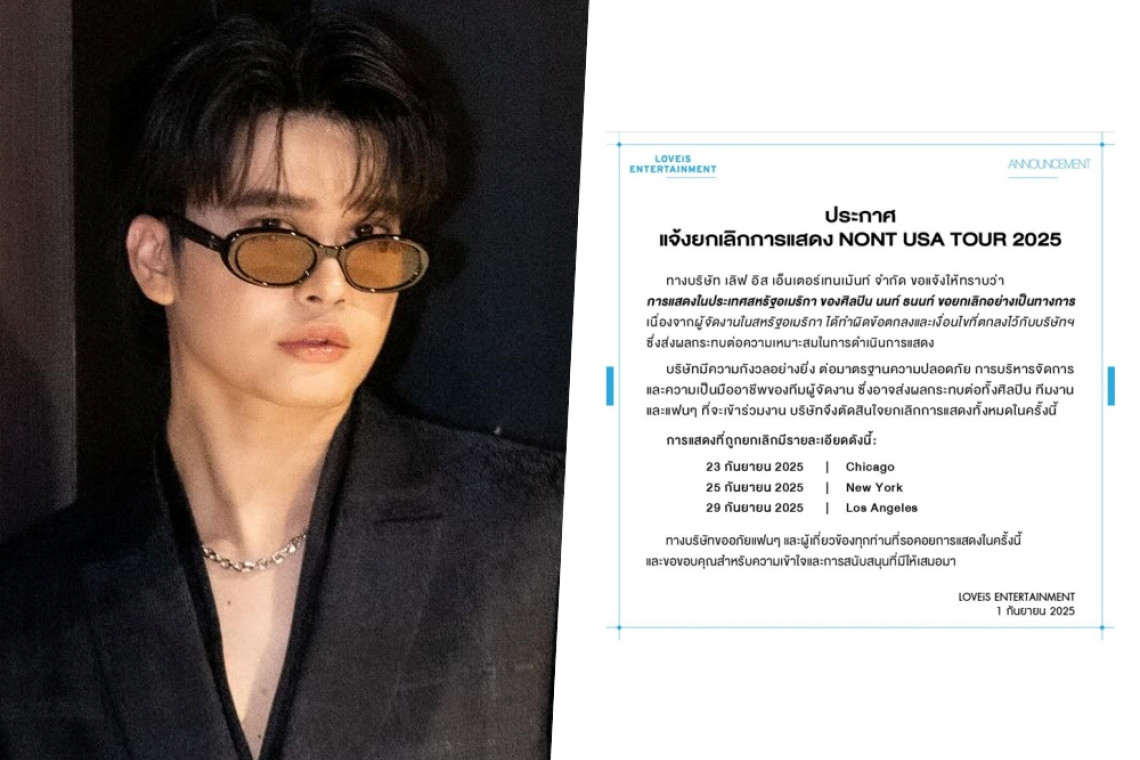 วันที่ 2 ก.ย.68 เพจ LOVEiS โพสต์ ประกาศ แจ้งยกเลิกการแสดง NONT USA TOUR 2025 โดยระบุข้อความว่า